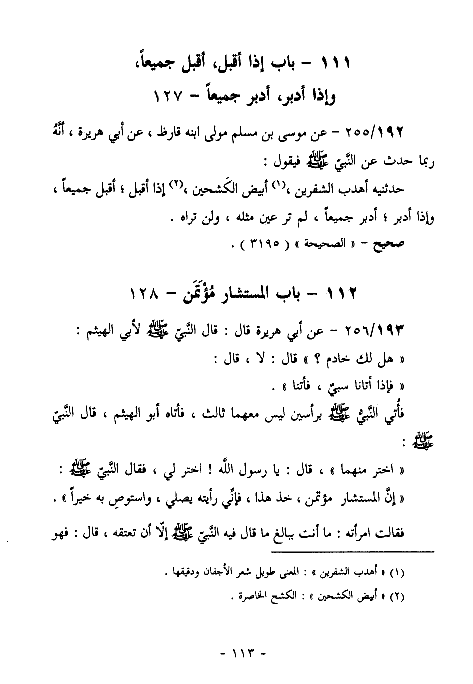 192/255 (صحيح) - عن مُوسَى بْنُ مُسْلِمٍ مَوْلَى ابنةِ قارظٍ، عَنْ أَبِي هُرَيْرَةَ أَنَّهُ رُبَّمَا حَدَّثَ، عَنِ النَّبِيِّ صَلَّى اللهُ عَلَيْهِ وَسَلَّمَ فَيَقُولُ: حَدَّثَنِيهِ أهدبُ الشُّفْرَيْنِ (¬1) ، أَبْيَضُ الْكَشْحَيْنِ (¬2) ، إِذَا أَقْبَلَ؛ أَقْبَلَ جَمِيعًا، وَإِذَا أَدْبَرَ أَدْبَرَ جَمِيعًا، لَمْ تَرَ عَيْنٌ مِثْلَهُ، وَلَنْ تَرَاهُ.