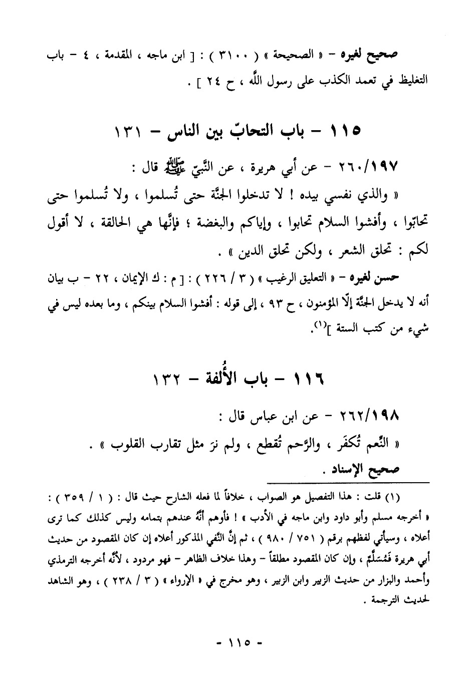 197/260 (حسن لغيره) - عَنْ أَبِي هُرَيْرَةَ، عَنِ النَّبِيِّ صَلَّى اللهُ عَلَيْهِ وَسَلَّمَ قَالَ: " وَالَّذِي نَفْسِي بِيَدِهِ! لَا تَدْخُلُوا الْجَنَّةَ حَتَّى تُسلموا، وَلَا تُسْلِمُوا حَتَّى تَحَابُّوا، وَأَفْشُوا السَّلَامَ تَحَابُّوا، وَإِيَّاكُمْ والبغضةَ؛ فَإِنَّهَا هِيَ الحالقةُ، لَا أَقُولُ لَكُمْ: تَحْلِقُ الشَّعْرَ، ولكن تحلق الدين".
