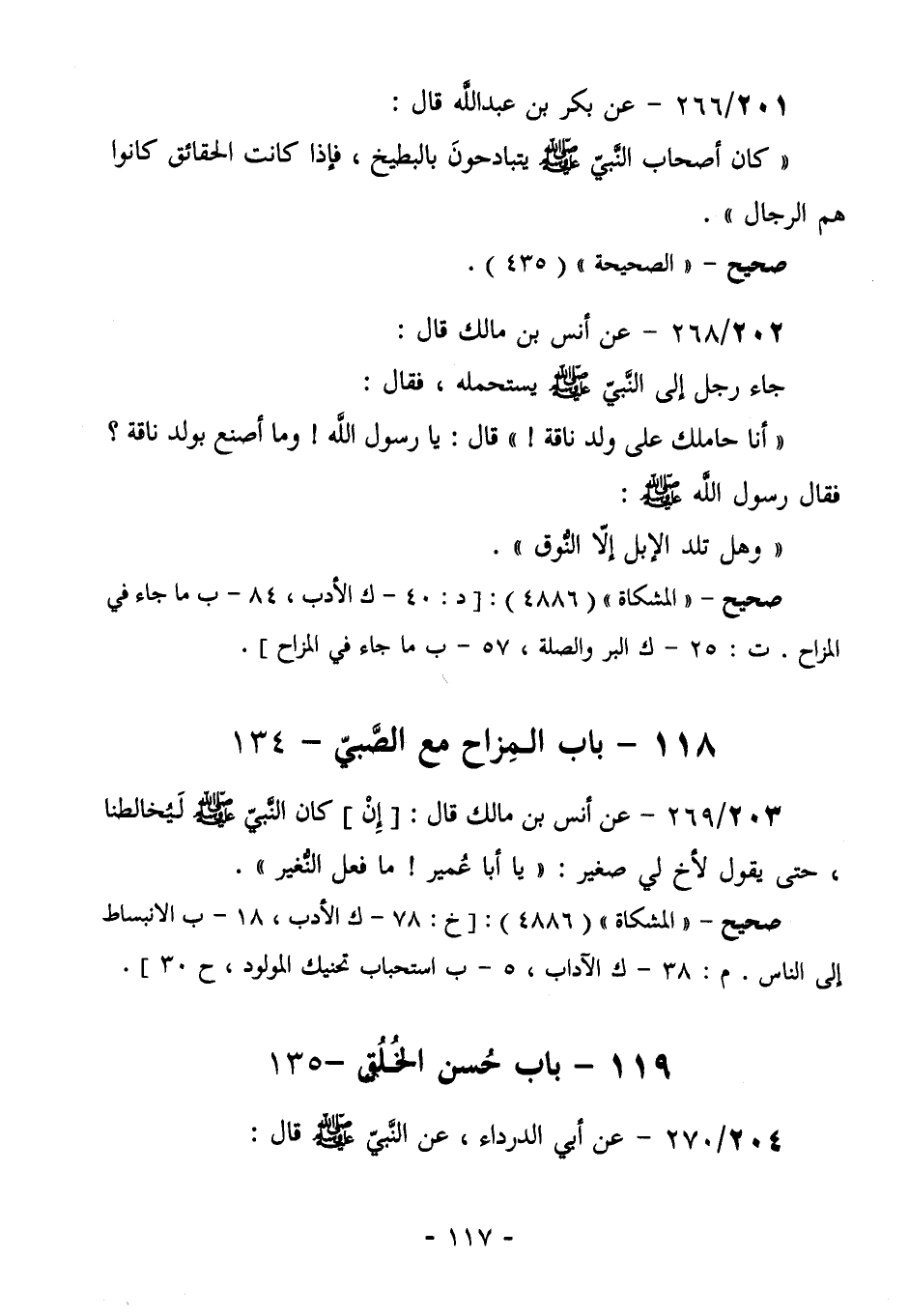 203/269- (صحيح) عَنْ أَنَسِ بْنِ مَالِكٍ قَالَ: [إن] كَانَ النَّبِيُّ صَلَّى اللهُ عَلَيْهِ وَسَلَّمَ لَيُخَالِطُنَا، حَتَّى يَقُولَ لأخٍ لِي صَغِيرٍ: " يَا أَبَا عُمير! ما فعلَ النّغير".