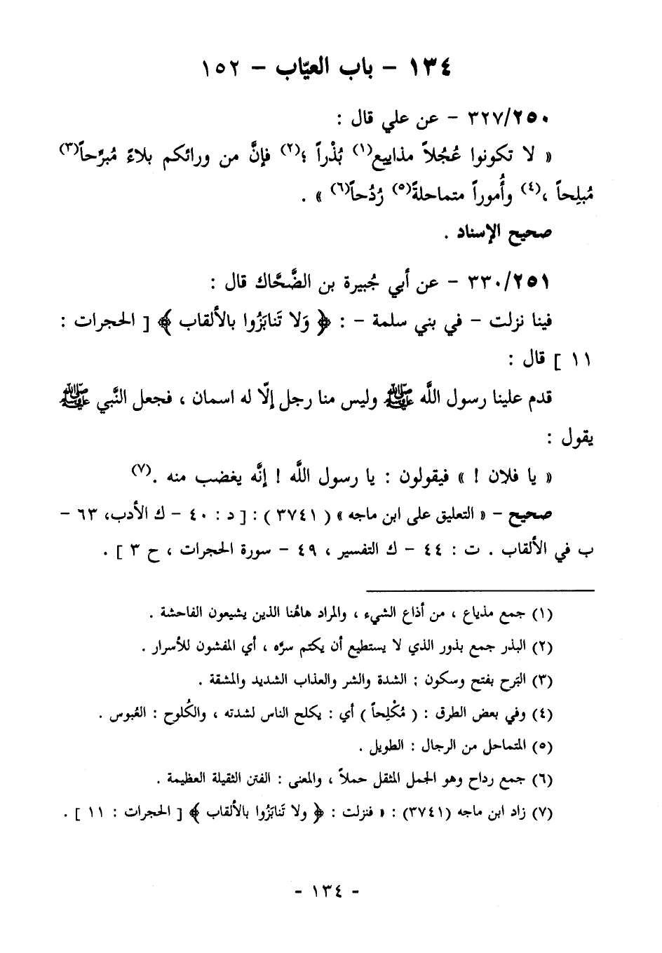 251/330 (صحيح) عن أبي جَبِيرَةَ بْنُ الضَّحَّاكِ قَالَ: فِينَا نَزَلَتْ- فِي بَنِي سَلِمَةَ- {وَلَا تَنَابَزُوا بِالْأَلْقَابِ} [الحجرات: 11] قَالَ: قَدِمَ عَلَيْنَا رَسُولُ اللَّهِ صَلَّى اللهُ عَلَيْهِ وَسَلَّمَ وَلَيْسَ مِنَّا رَجُلٌ إِلَّا لَهُ اسْمَانِ، فَجَعَلَ النَّبِيُّ صَلَّى اللهُ عَلَيْهِ وَسَلَّمَ يَقُولُ: "يا فلان! " فيقولون: يارسول الله! إنه يغضب منه (¬7) .