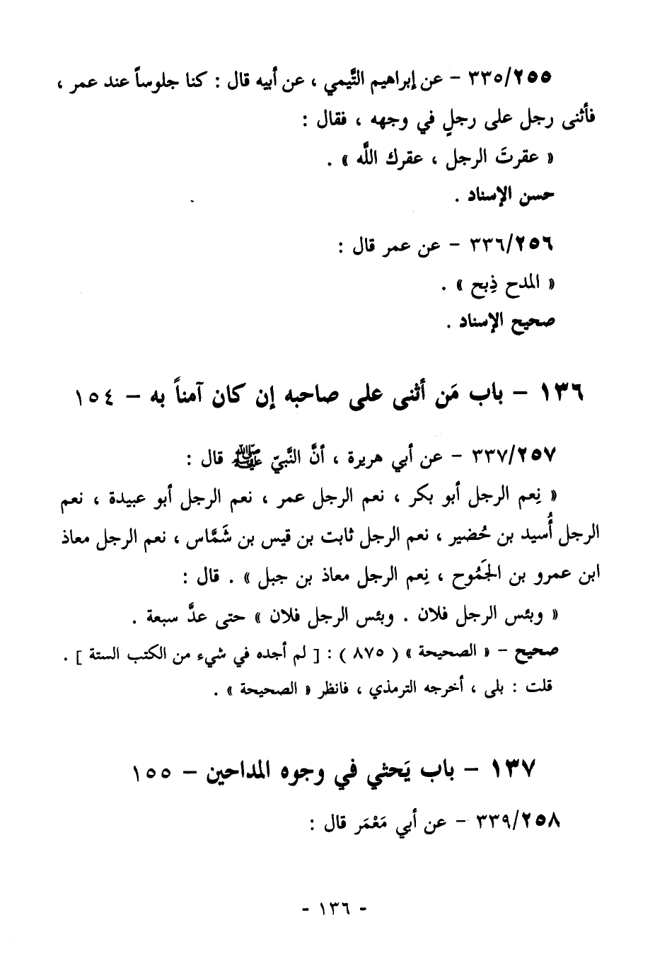 255/335 (صحيح الإسناد) عَنْ إِبْرَاهِيمَ التَّيْمِيِّ، عَنْ أَبِيهِ قَالَ: كُنَّا جُلُوسًا عِنْدَ عُمر، فَأَثْنَى رجلٌ عَلَى رجلٍ فِي وَجْهِهِ. فَقَالَ: " عَقَرْتَ الرَّجُلَ، عَقَرَكَ الله ".