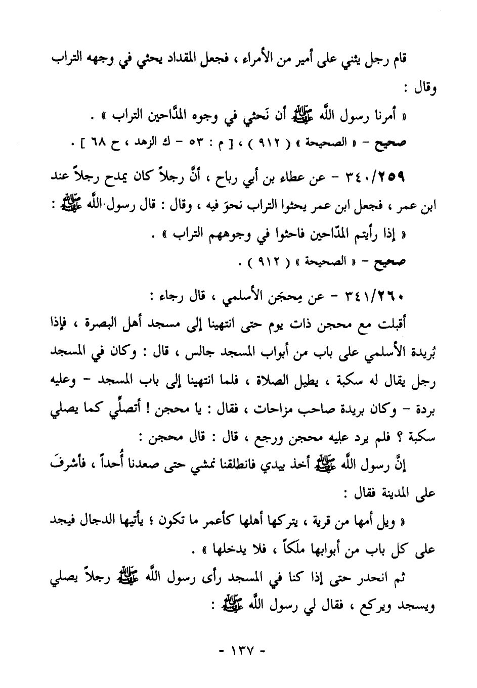 259/340 (صحيح) عَنْ عَطَاءِ بْنِ أَبِي رَبَاحٍ؛ أَنَّ رَجُلًا كَانَ يَمْدَحُ رَجُلًا عِنْدَ ابْنِ عُمَرَ، فَجَعَلَ ابْنُ عمر يحثُ التُّرَابَ نَحْوَ فِيهِ، وَقَالَ: قَالَ رَسُولَ اللَّهِ صَلَّى اللهُ عَلَيْهِ وَسَلَّمَ: " إِذَا رَأَيْتُمُ الْمَدَّاحِينَ، فَاحْثُوا في وجوههم التراب".