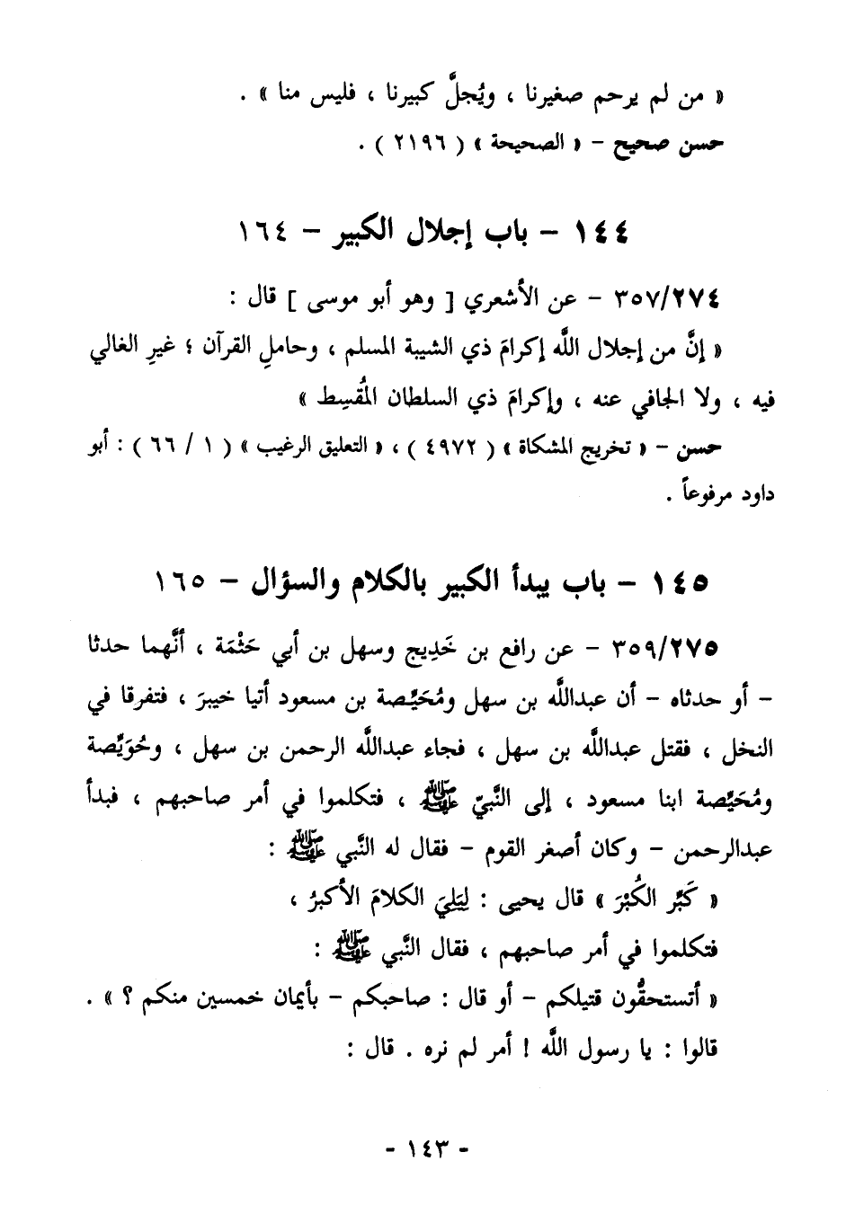 275/359 (صحيح) عَنْ رَافِعِ بْنِ خَدِيجٍ وَسَهْلِ بْنِ أَبِي حَثْمَةَ، أَنَّهُمَا حَدَثَا - أَوْ حَدَّثَاهُ- أَنَّ عَبْدَ اللَّهِ بْنَ سَهْلٍ وَمُحَيِّصَةَ بْنَ مَسْعُودٍ أَتَيَا خَيْبَرَ، فَتَفَرَّقَا فِي النَّخْلِ، فَقُتِلَ عَبْدُ اللَّهِ بْنُ سَهْلٍ، فَجَاءَ عَبْدُ الرَّحْمَنِ بْنُ سَهْلٍ، وَحُوَيِّصَةُ وَمُحَيِّصَةُ ابْنَا مَسْعُودٍ إِلَى النَّبِيَّ صَلَّى اللهُ عَلَيْهِ وَسَلَّمَ، فَتَكَلَّمُوا فِي أَمْرِ صَاحِبِهِمْ، فَبَدَأَ عَبْدُ الرَّحْمَنِ، وَكَانَ أَصْغَرَ الْقَوْمِ! فَقَالَ لَهُ النَّبِيُّ صَلَّى اللهُ عليه وسلم: "الكبر الْكِبَرَ"- قَالَ يَحْيَى ليَلي الْكَلَامَ الْأَكْبَرُ- فَتَكَلَّمُوا فِي أَمْرِ صَاحِبِهِمْ. فَقَالَ النَّبِيُّ صَلَّى اللهُ عَلَيْهِ وَسَلَّمَ: "اسْتَحِقُّوا قَتِيلَكُمْ- أَوْ قَالَ صَاحِبَكُمْ- بِأَيْمَانِ خَمْسِينَ مِنْكُمْ؟ ". قَالُوا: يَا رَسُولَ اللَّهِ! أمرٌ لَمْ نره. قال: