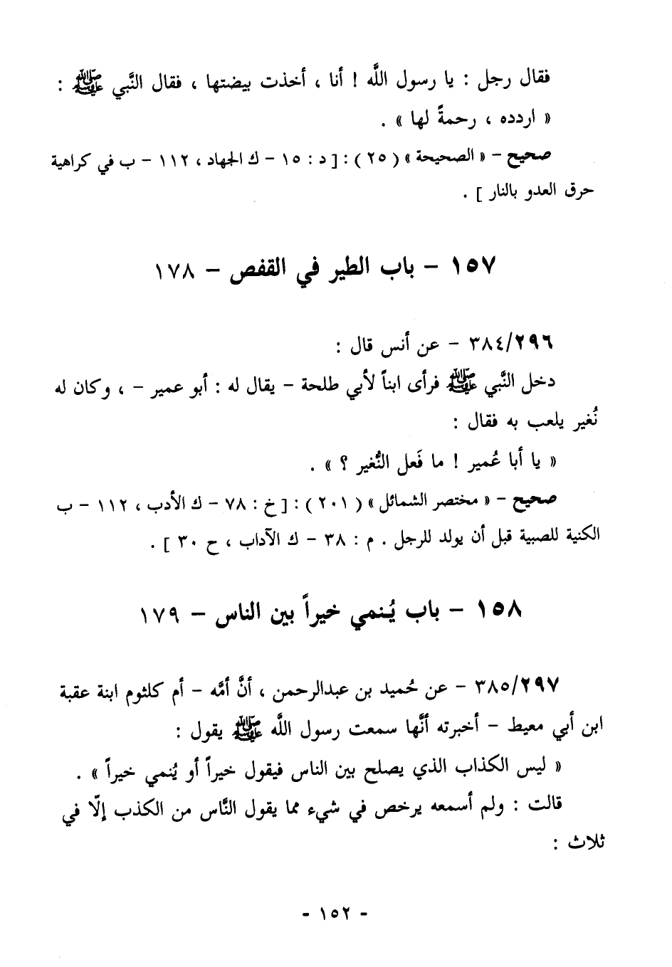296/2/384 (صحيح) عَنْ أَنَسٍ قَالَ: دَخَلَ النَّبِيُّ صَلَّى اللهُ عَلَيْهِ وَسَلَّمَ فَرَأَى ابْنًا لِأَبِي طَلْحَةَ- يُقَالُ لَهُ: أَبُو عُمَيْرٍ-، وَكَانَ لَهُ نُغَيْرٌ يَلْعَبُ بِهِ. فَقَالَ: " يَا أَبَا عُمَيْرٍ! مَا فَعَلَ - أَوْ أَيْنَ النُّغَيْرُ؟ ".