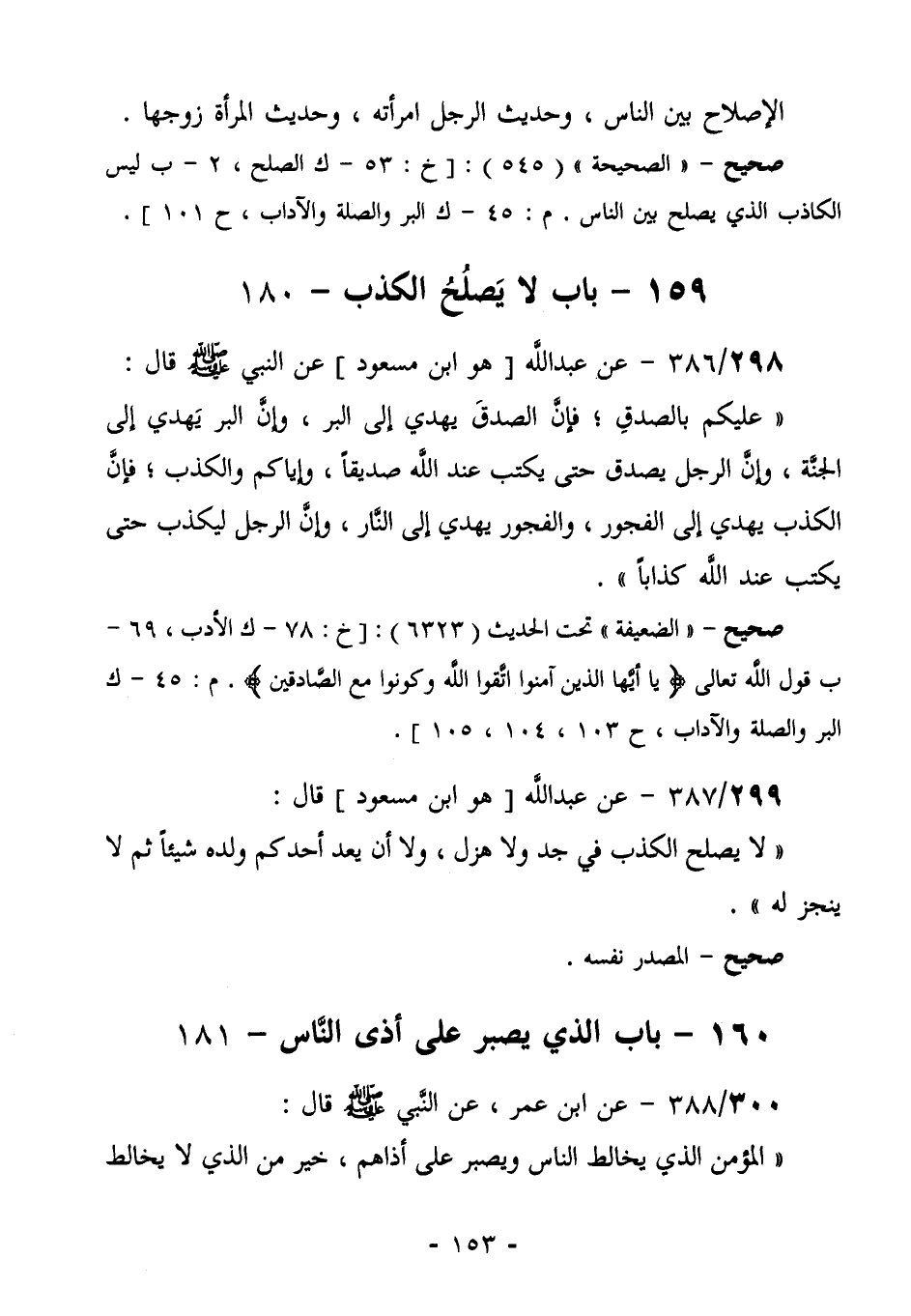298/386 (صحيح) عن عبد الله [هو ابْنِ مَسْعُودٍ] ، عَنِ النَّبِيِّ صَلَّى اللهُ عَلَيْهِ وَسَلَّمَ قَالَ: "عَلَيْكُمْ بِالصِّدْقِ؛ فَإِنَّ الصِّدْقَ يَهْدِي إِلَى الْبِرِّ، وَإِنَّ الْبِرَّ يَهْدِي إِلَى الْجَنَّةِ، وَإِنَّ الرَّجُلَ يَصْدُقُ حَتَّى يُكْتَبَ عِنْدَ اللَّهِ صِدِّيقًا، وَإِيَّاكُمْ وَالْكَذِبَ؛ فَإِنَّ الْكَذِبَ يَهْدِي إِلَى الْفُجُورِ، وَالْفُجُورَ يَهْدِي إِلَى النَّارِ، وَإِنَّ الرَّجُلَ لَيَكْذِبُ حَتَّى يُكتب عند الله كذاباً".