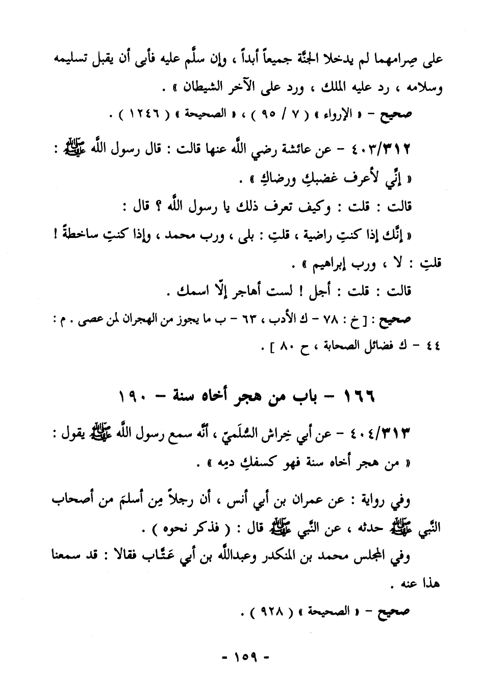 312/403 (صحيح) عَنْ عَائِشَةَ رَضِيَ اللَّهُ عَنْهَا قَالَتْ: قَالَ رَسُولُ اللَّهِ صَلَّى اللهُ عَلَيْهِ وَسَلَّمَ: " إِنِّي لَأَعْرِفُ غَضَبَكِ وَرِضَاكِ". قَالَتْ: قلتُ وَكَيْفَ تَعْرِفُ ذَلِكَ يَا رَسُولَ اللَّهِ؟ قَالَ: " إِنَّكِ إِذَا كُنْتِ رَاضِيَةً، قلتِ: بَلَى، وَرَبِّ محمدٍ، وَإِذَا كُنْتِ سَاخِطَةً! قلتِ: لَا، وَرَبِّ إبراهيم". قالت: أَجَلْ! لستُ أُهَاجِرُ إِلَّا اسْمَكَ.
