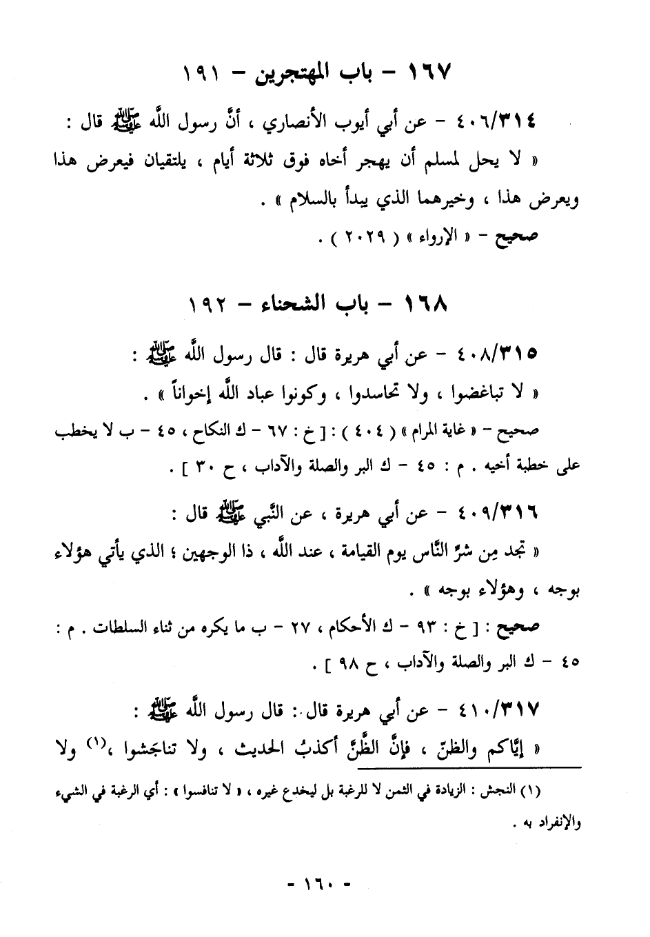 315/408 (صحيح) عَنْ أَبِي هُرَيْرَةَ، قَالَ: قَالَ رَسُولَ اللَّهِ صَلَّى اللهُ عَلَيْهِ وَسَلَّمَ: "لَا تَبَاغَضُوا، وَلَا تَحَاسَدُوا، وكونوا عباد الله إخواناً".