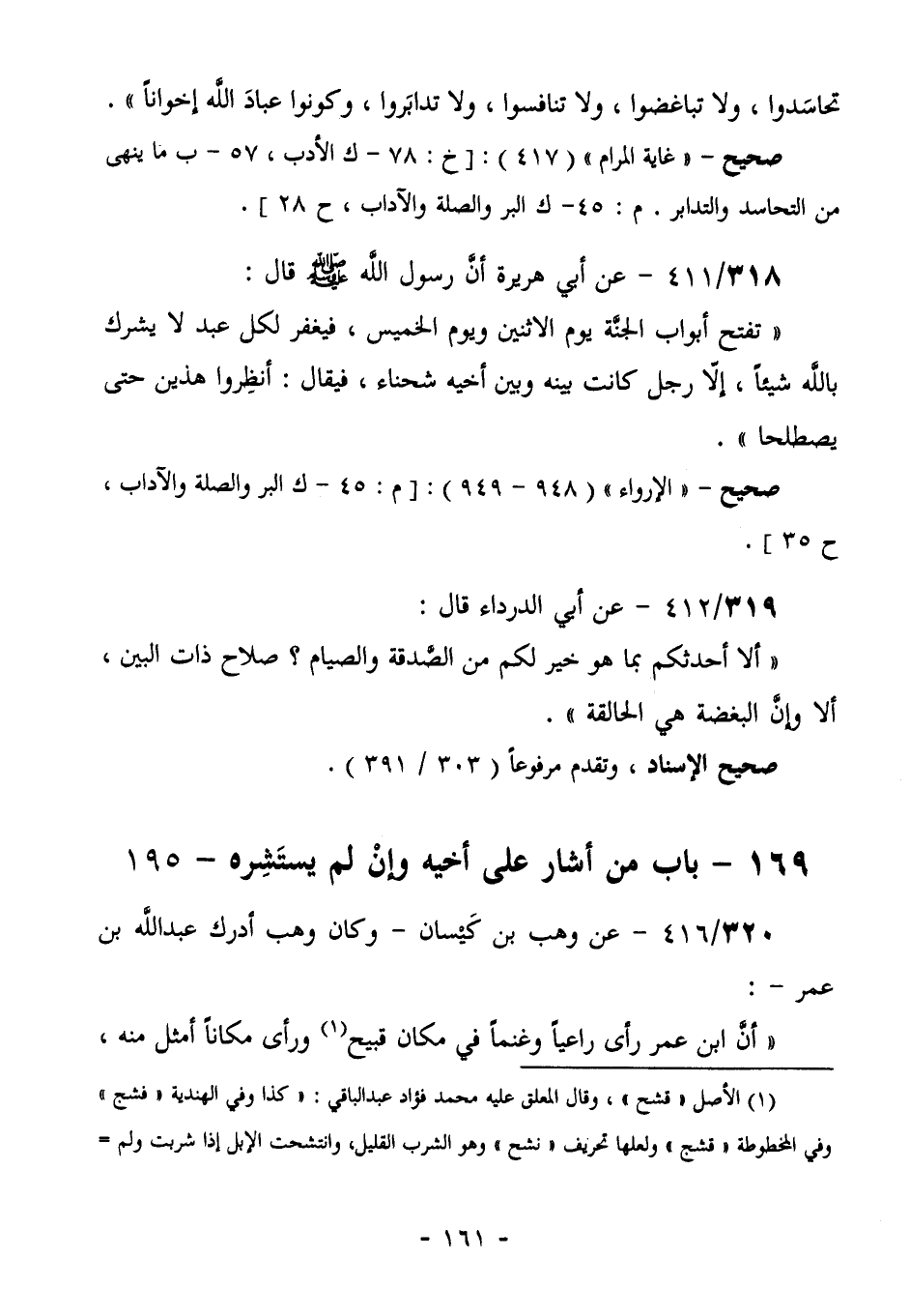 318/411 (صحيح) عَنْ أَبِي هُرَيْرَةَ، أَنَّ رَسُولَ اللَّهِ صَلَّى اللهُ عَلَيْهِ وَسَلَّمَ قَالَ: " تُفْتَحُ أَبْوَابُ الْجَنَّةِ يَوْمَ الاثنين والخميس، فَيُغْفَرُ لِكُلِّ عَبْدٍ لَا يُشْرِكُ بِاللَّهِ شَيْئًا، إِلَّا رَجُلٌ كَانَتْ بَيْنَهُ وَبَيْنَ أَخِيهِ شَحْنَاءُ. فَيُقَالُ: أنظروا هذين حتى يصطلحا".