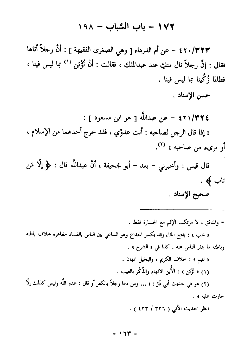 324/421 (صحيح الإٍسناد) عن عبد الله [هو ابن مسعود] : " إِذَا قَالَ الرَّجُلُ لِصَاحِبِهِ: أَنْتَ عَدُوِّي، فَقَدْ خَرَجَ أَحَدُهُمَا مِنَ الإسلام، أوبرئ من صاحبه" (¬2) .