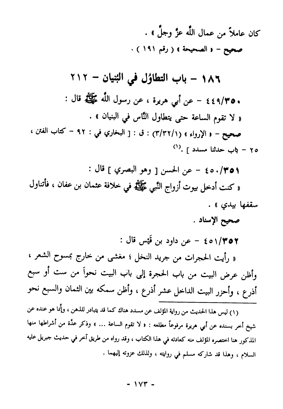 350/449 (صحيح) عَنْ أَبِي هُرَيْرَةَ، عَنْ رَسُولِ اللَّهِ صَلَّى اللهُ عَلَيْهِ وَسَلَّمَ قَالَ: " لَا تَقُومُ السَّاعَةُ حَتَّى يتطاول الناس في البنيان".