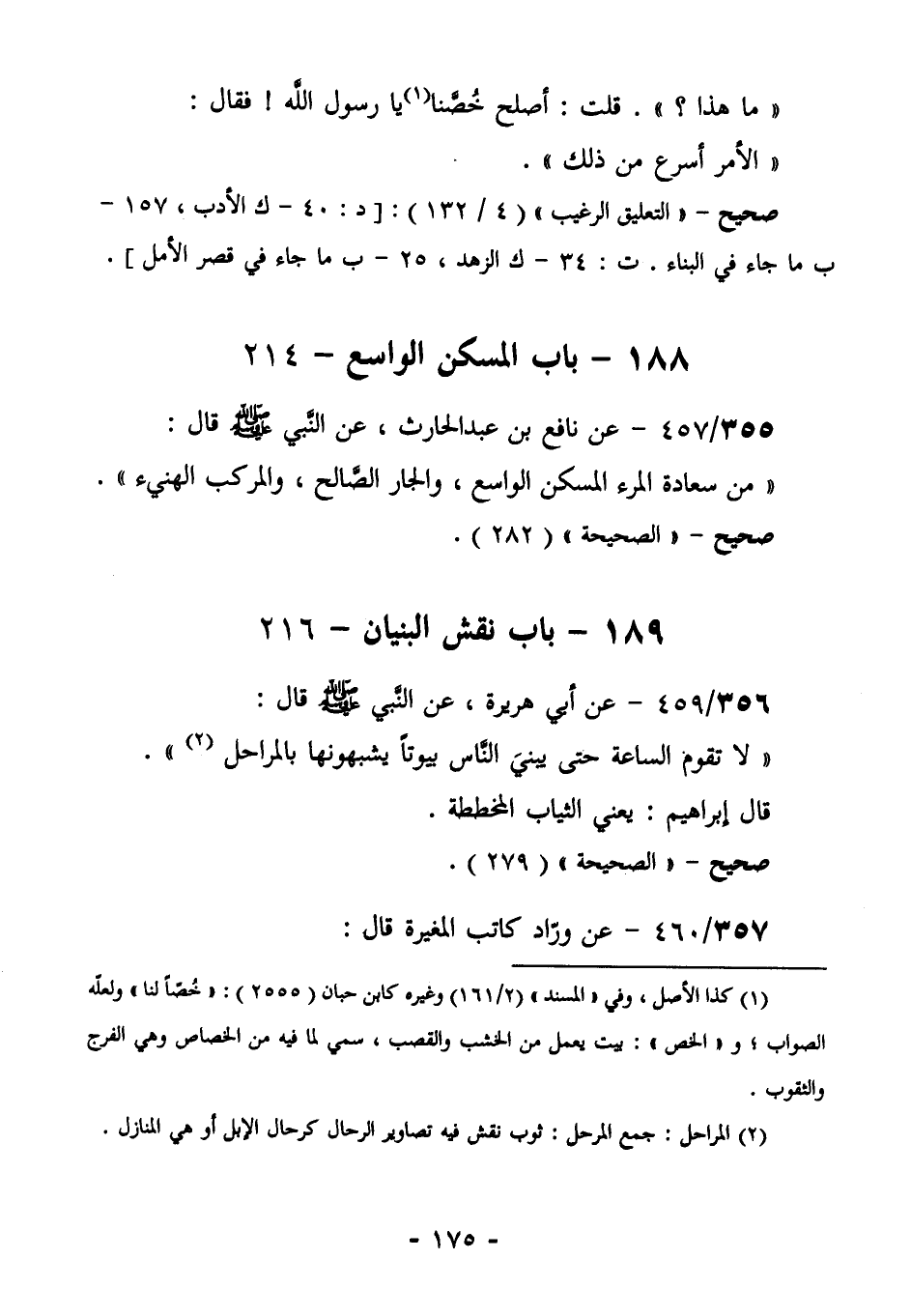 356/459 (صحيح) عَنْ أَبِي هُرَيْرَةَ، عَنِ النَّبِيِّ صَلَّى اللهُ عَلَيْهِ وَسَلَّمَ قَالَ: " لَا تَقُومُ السَّاعَةُ حَتَّى يَبْنِيَ النَّاسُ بُيُوتًا، يُشَبِّهُونَهَا بِالْمَرَاحِلِ" (¬2) . قَالَ إبراهيم: يعني الثياب المخططة.