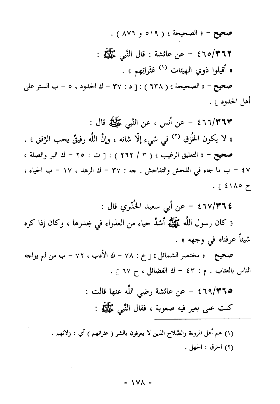 362/465 (صحيح) عن عَائِشَةُ: قَالَ النَّبِيُّ صَلَّى اللهُ عَلَيْهِ وَسَلَّمَ: "أَقِيلُوا ذَوِيِ الْهَيْئَاتِ (¬1) عثراتهم".
