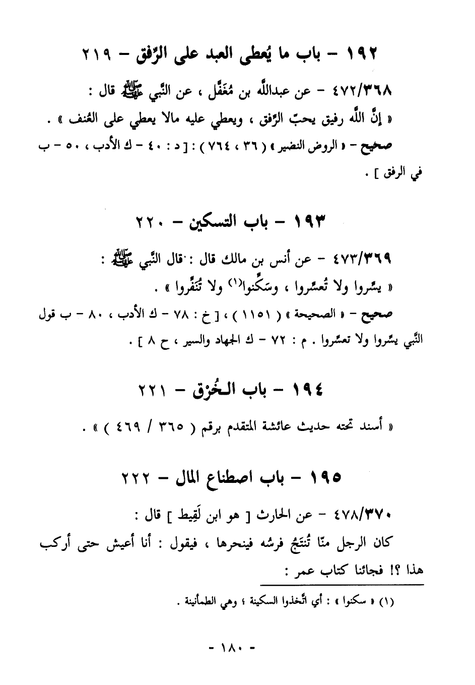 196/473 (صحيح) عَنْ أَنَسِ بْنِ مَالِكٍ قَالَ: قَالَ النَّبِيُّ صَلَّى اللهُ عَلَيْهِ وَسَلَّمَ: " يَسِّرُوا وَلَا تُعَسِّرُوا، وَسَكِّنُوا (¬1) ولا تنفروا".