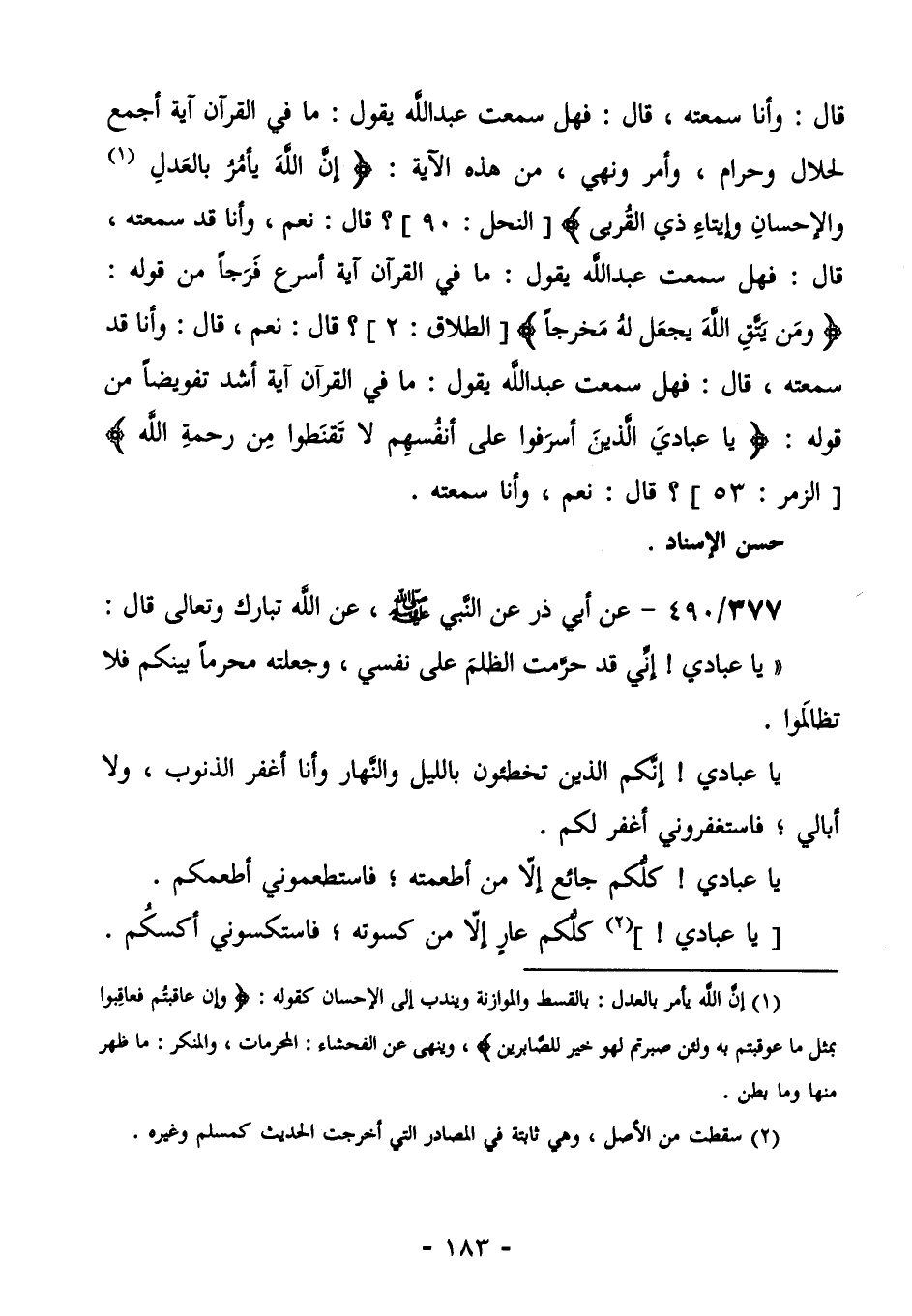 377/490 (صحيح) عَنْ أَبِي ذَرٍّ، عَنِ النَّبِيِّ صَلَّى اللهُ عَلَيْهِ وَسَلَّمَ، عَنِ اللَّهِ تَبَارَكَ وَتَعَالَى قَالَ: " يَا عِبَادِي! إِنِّي قَدْ حَرَّمْتُ الظُّلْمَ عَلَى نَفْسِي، وَجَعَلْتُهُ مُحَرَّمًا بَيْنَكُمْ فَلَا تَظَالَمُوا. يَا عِبَادِي! إِنَّكُمُ الَّذِينَ تُخْطِئُونَ بِاللَّيْلِ وَالنَّهَارِ وَأَنَا أَغْفِرُ الذُّنُوبَ، وَلَا أُبَالِي؛ فَاسْتَغْفِرُونِي أَغْفِرْ لَكُمْ. يَا عِبَادِي! كُلُّكُمْ جَائِعٌ إِلَّا مَنْ أَطْعَمْتُهُ؛ فَاسْتَطْعِمُونِي أُطْعِمْكُمْ. [يَا عِبَادِي] ! (¬2) كُلُّكُمْ عارٍ إِلَّا مِنْ كَسَوْتُهُ؛ فَاسْتَكْسُونِي أَكْسُكُمْ.