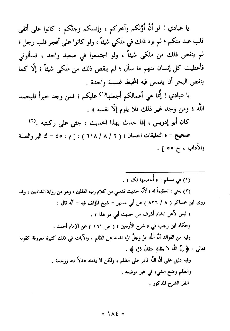 يَا عِبَادِي! لَوْ أَنَّ أَوَّلَكُمْ وَآخِرَكُمْ، وَإِنْسَكُمْ وَجِنَّكُمْ، كَانُوا عَلَى أَتْقَى قَلْبِ عَبْدٍ مِنْكُمْ، لَمْ يَزِدْ ذَلِكَ فِي مُلْكِي شَيْئًا، وَلَوْ كَانُوا عَلَى أَفْجَرِ قَلْبِ رَجُلٍ، لَمْ يَنْقُصْ ذَلِكَ مِنْ مُلْكِي شَيْئًا، وَلَوِ اجْتَمَعُوا فِي صَعِيدٍ وَاحِدٍ، فَسَأَلُونِي فَأَعْطَيْتُ كُلَّ إِنْسَانٍ مِنْهُمْ مَا سَأَلَ؛ لَمْ يَنْقُصْ ذَلِكَ مِنْ مُلْكِي شَيْئًا؛ إِلَّا كَمَا يَنْقُصُ الْبَحْرُ أَنْ يغمس فيه الخط غَمْسَةً وَاحِدَةً. يَا عِبَادِي! إِنَّمَا هِيَ أَعْمَالُكُمْ أَجْعَلُهَا (¬1) عَلَيْكُمْ؛ فَمَنْ وَجَدَ خَيْرًا فَلْيَحْمَدِ اللَّهَ؛ وَمَنْ وَجَدَ غَيْرَ ذَلِكَ فَلَا يَلُومُ إِلَّا نَفْسَهُ". كَانَ أَبُو إِدْرِيسَ، إِذَا حَدَّثَ بِهَذَا الْحَدِيثِ، جَثَى على ركبتيه. (¬2) .