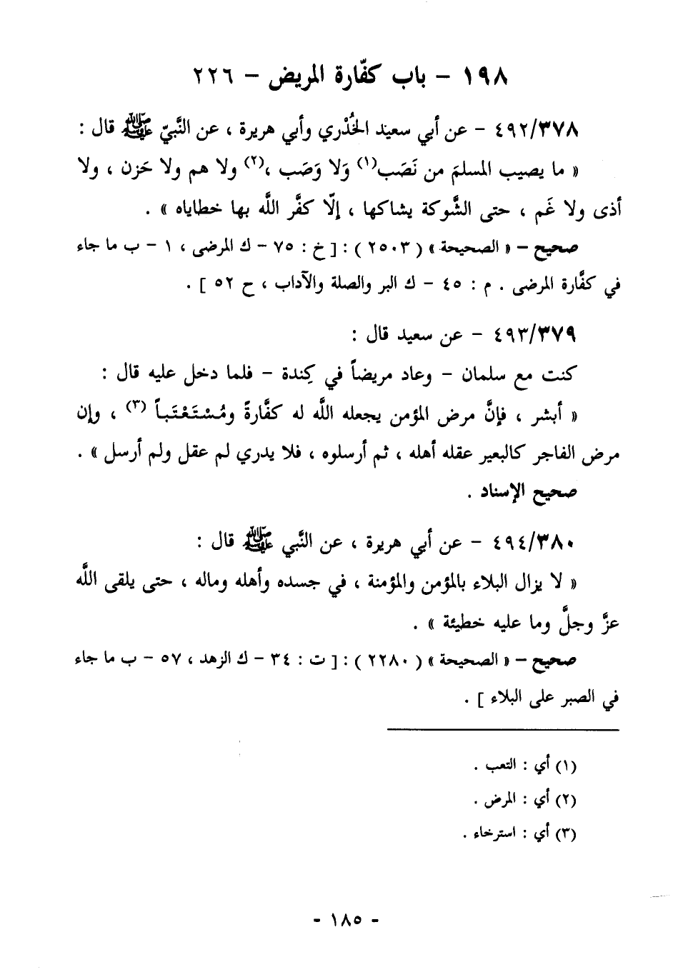 379/493 (صحيح الإسناد) عن سعيد قَالَ: كُنْتُ مَعَ سَلْمَانَ- وَعَادَ مَرِيضًا فِي كِنْدَةَ - فَلَمَّا دَخَلَ عَلَيْهِ قَالَ: "أَبْشِرْ؛ فَإِنَّ مَرَضَ الْمُؤْمِنِ يَجْعَلُهُ اللَّهُ لَهُ كَفَّارَةً وَمُسْتَعْتَبًا (¬3) ، وَإِنَّ مَرَضَ الْفَاجِرِ كَالْبَعِيرِ عَقَلَهُ أَهْلُهُ، ثُمَّ أَرْسَلُوهُ، فَلَا يَدْرِي لِمَ عُقِلَ وَلِمَ أُرْسِلَ". 380/494 (صحيح) عَنْ أَبِي هُرَيْرَةَ، عَنِ النَّبِيِّ صَلَّى اللهُ عَلَيْهِ وَسَلَّمَ قَالَ: " لَا يَزَالُ الْبَلَاءُ بِالْمُؤْمِنِ وَالْمُؤْمِنَةِ، فِي جَسَدِهِ وَأَهْلِهِ وَمَالِهِ، حَتَّى يلقى الله وما عليه خطيئة".