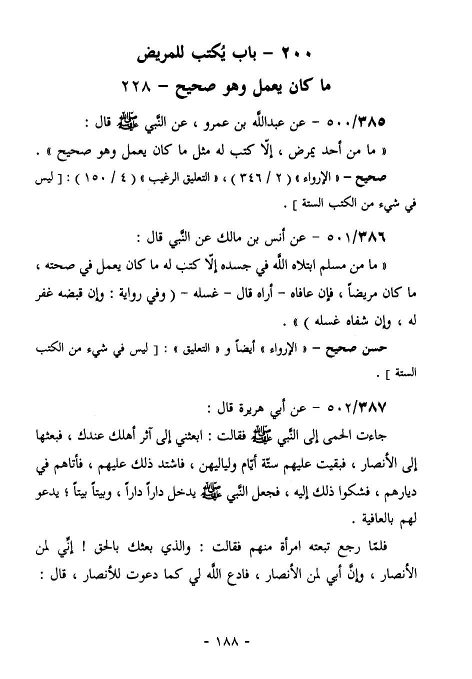 386/501 (حسن صحيح) عَنْ أَنَسِ بْنِ مَالِكٍ، عَنِ النَّبِيَّ صَلَّى اللهُ عَلَيْهِ وَسَلَّمَ قَالَ: " مَا مِنْ مُسْلِمٍ ابْتَلَاهُ اللَّهُ فِي جَسَدِهِ إِلَّا كُتِبَ لَهُ مَا كَانَ يَعْمَلُ فِي صِحَّتِهِ، مَا كَانَ مَرِيضًا، فَإِنْ عافاه- أراه قال: - غسلَه، وإن قبضه غفر له (وفي رواية: فإن شفاه عسلَه) ". 387/502 (صحيح) عَنْ أَبِي هُرَيْرَةَ، قَالَ: جَاءَتِ الْحُمَّى إِلَى النَّبِيِّ صَلَّى اللهُ عليه وسلم صَلَّى اللهُ عَلَيْهِ وَسَلَّمَ، فَقَالَ: ابْعَثْنِي إِلَى آثَرِ أَهْلِكَ عِنْدَكَ، فَبَعَثَهَا إِلَى الْأَنْصَارِ، فَبَقِيَتْ عَلَيْهِمْ ستة أيام وليالهن، فاشتد عَلَيْهِمْ، فَأَتَاهُمْ فِي دِيَارِهِمْ، فَشَكَوْا ذَلِكَ إِلَيْهِ، فَجَعَلَ النَّبِيُّ صَلَّى اللهُ عَلَيْهِ وَسَلَّمَ يَدْخُلُ دَارًا دَارًا، وَبَيْتًا بَيْتًا، يَدْعُو لَهُمْ بِالْعَافِيَةِ. فَلَمَّا رَجَعَ تَبِعَتْهُ امْرَأَةٌ مِنْهُمْ، فَقَالَتْ: وَالَّذِي بَعَثَكَ بِالْحَقِّ إِنِّي لِمَنَ الْأَنْصَارِ، وَإِنَّ أَبِي لِمَنَ الْأَنْصَارِ، فَادْعُ اللَّهَ لِي كما دعوت للأنصار.