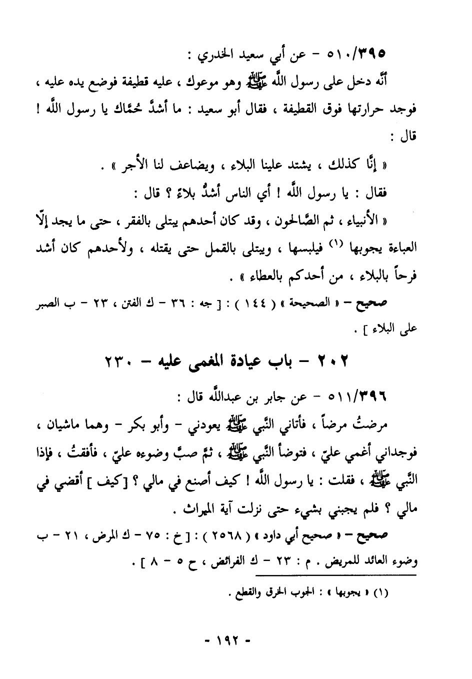 395/510 (صحيح) عَنْ أَبِي سَعِيدٍ الْخُدْرِيِّ: أَنَّهُ دَخَلَ عَلَى رَسُولِ اللَّهِ صَلَّى اللهُ عَلَيْهِ وَسَلَّمَ وَهُوَ مَوْعُوكٌ، عَلَيْهِ قَطِيفَةٌ، فَوَضَعَ يَدَهُ عَلَيْهِ، فَوَجَدَ حَرَارَتَهَا فَوْقَ الْقَطِيفَةِ. فَقَالَ أَبُو سَعِيدٍ: مَا أَشَدَّ حُمَّاكَ يَا رَسُولَ اللَّهِ! قَالَ: "إِنَّا كَذَلِكَ، يَشْتَدُّ عَلَيْنَا الْبَلَاءُ، وَيُضَاعَفُ لَنَا الْأَجْرُ". فَقَالَ: يَا رَسُولَ اللَّهِ! أَيُّ النَّاسِ أَشَدُّ بَلَاءً؟. قَالَ: "الْأَنْبِيَاءُ ثُمَّ الصَّالِحُونَ، وَقَدْ كَانَ أَحَدُهُمْ يُبْتَلَى بِالْفَقْرِ، حَتَّى مَا يَجِدُ إِلَّا الْعَبَاءَةَ (¬1) يجوبُها فَيَلْبَسُهَا، وَيُبْتَلَى بِالْقُمَّلِ حَتَّى يَقْتُلَهُ، وَلَأَحَدُهُمْ كَانَ أَشَدَّ فَرَحًا بِالْبَلَاءِ، مِنْ أَحَدِكُمْ بِالْعَطَاءِ".