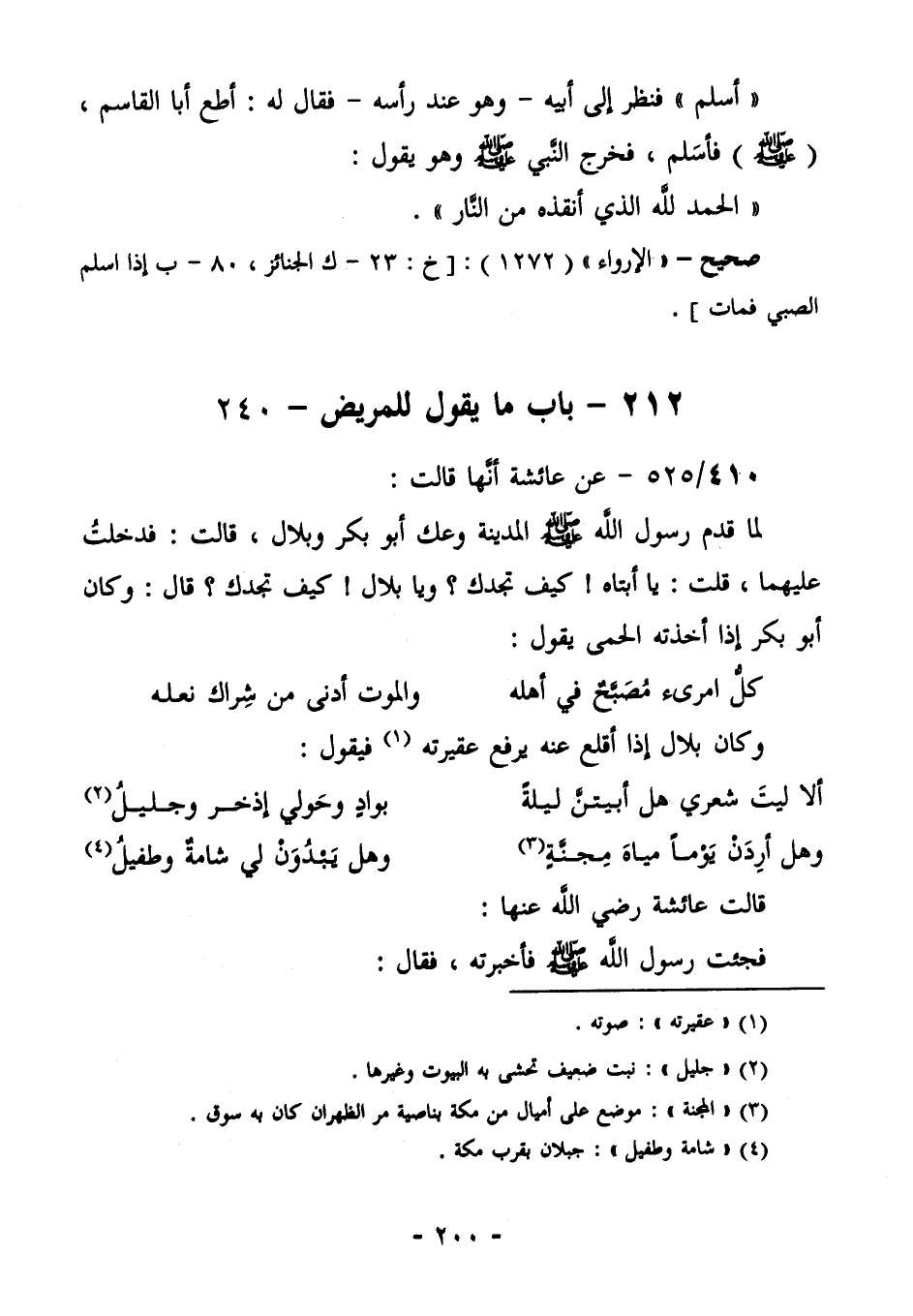 410/525 (صحيح) عَنْ عَائِشَةَ؛ أَنَّهَا قَالَتْ: لَمَّا قَدَمِ رَسُولِ اللَّهِ صَلَّى اللهُ عَلَيْهِ وَسَلَّمَ الْمَدِينَةَ وعكَ أَبُو بَكْرٍ وَبِلَالٌ. قَالَتْ: فَدَخَلْتُ عَلَيْهِمَا. قُلْتُ: يَا أَبَتَاهُ! كَيْفَ تَجِدُكَ؟ وَيَا بِلَالُ! كَيْفَ تَجِدُكَ؟ قَالَ: وَكَانَ أَبُو بَكْرٍ إِذَا أَخَذَتْهُ الحمى يقول:
