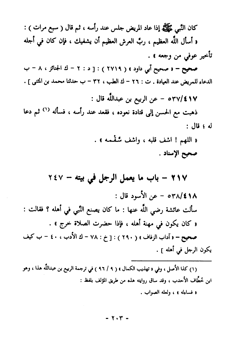 418/538 (صحيح) عَنِ الْأَسْوَدِ قَالَ: سَأَلْتُ عَائِشَةَ رَضِيَ اللَّهُ عَنْهَا: مَا كَانَ يَصْنَعُ النَّبِيُّ صَلَّى اللهُ عَلَيْهِ وَسَلَّمَ فِي أَهْلِهِ؟ فَقَالَتْ: "كَانَ يَكُونُ فِي مِهْنَةِ أَهْلِهِ، فَإِذَا حضرت الصلاة خرج".