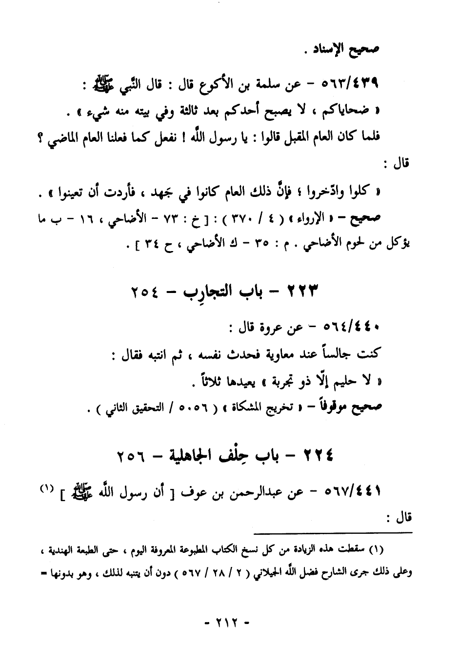 (¬1) سقطت هذه الزيادة من كل نسخة الكتاب المطبوعة المعروفة اليوم، حتى الطبعة الهندية، وعلى ذلك جرى الشارح فضل الله الجيلاني (2/28/567) دون أن يتنبه لذلك، وهو بدونها يصير الحديث موقوفاً على عبد الرحمن بن عوف، مع أنه عزاه لأحمد (1/190) وهو عنده مرفوع وكذلك وهو في كل المصادر التي كنت عزوت الحديث إليها في المصدر المذكور أعلاه، وكذلك عزاه الحافظ في "الفتح" (10/502) لبعضها.
