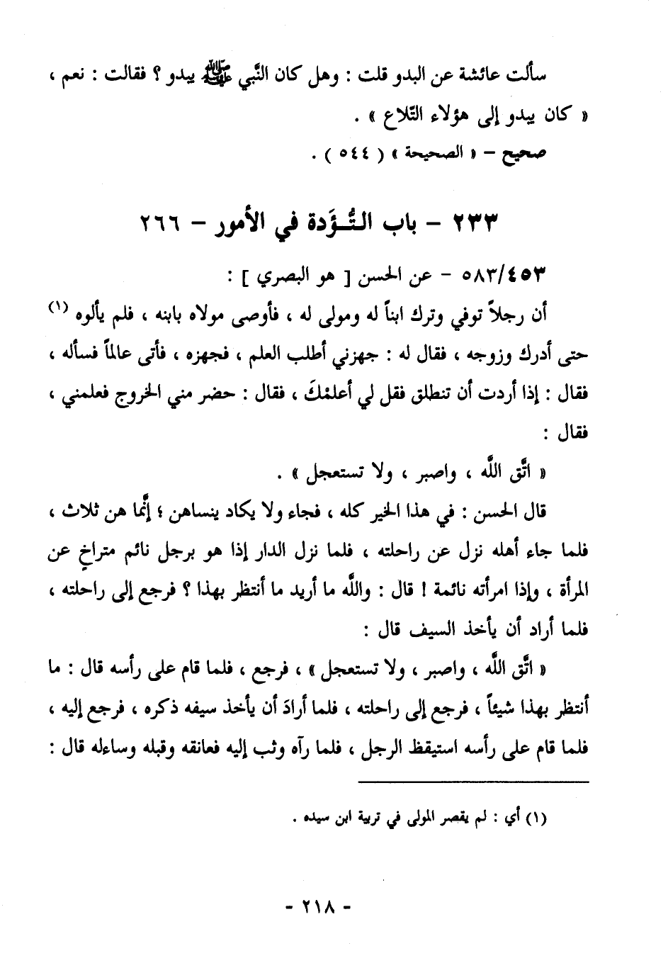 454/583 (حسن الإسناد) عن الحسن [هو البصري] ؛ أَنَّ رَجُلًا تُوُفِّيَ، وَتَرَكَ ابْنًا لَهُ وَمَوْلًى لَهُ، فَأَوْصَى مَوْلَاهُ بِابْنِهِ، فَلَمْ يَأْلُوهُ (¬1) حَتَّى أَدْرَكَ وَزَوَّجَهُ. فَقَالَ لَهُ: جَهَّزْنِي أَطْلُبِ الْعِلْمَ، فَجَهَّزَهُ، فَأَتَى عَالِمًا فَسَأَلَهُ. فَقَالَ: إِذَا أَرَدْتَ أَنْ تَنْطَلِقَ فَقُلْ لِي: أُعَلِّمْكَ. فَقَالَ: حَضَرَ مِنِّي الْخُرُوجُ، فَعَلِّمْنِي. فَقَالَ: "اتَّقِ اللَّهَ، وَاصْبِرْ، وَلَا تَسْتَعْجِلْ". قَالَ الْحَسَنُ: فِي هَذَا الْخَيْرُ كُلُّهُ - فَجَاءَ وَلَا يَكَادُ يَنْسَاهُنَّ؛ إِنَّمَا هُنَّ ثَلَاثٌ- فَلَمَّا جَاءَ أَهْلَهُ، نَزَلَ عَنْ رَاحِلَتِهِ، فَلَمَّا نَزَلَ الدَّارَ إِذَا هُوَ بِرَجُلٍ نَائِمٍ مُتَرَاخٍ عَنِ الْمَرْأَةِ، وَإِذَا امْرَأَتُهُ نَائِمَةٌ! قَالَ: وَاللَّهِ مَا أُرِيدُ مَا أَنْتَظِرُ بِهَذَا؟ فَرَجَعَ إِلَى رَاحِلَتِهِ، فَلَمَّا أَرَادَ أَنْ يَأْخُذَ السَّيْفَ قَالَ: "اتَّقِ اللَّهَ، وَاصْبِرْ وَلَا تَسْتَعْجِلْ" فَرَجَعَ، فَلَمَّا قَامَ عَلَى رَأْسِهِ قَالَ: مَا أَنْتَظِرُ بهذا شيئاً، فرجع على رَاحِلَتِهِ، فَلَمَّا أَرَادَ أَنْ يَأْخُذَ سَيْفَهُ ذَكَرَهُ، فَرَجَعَ إِلَيْهِ، فَلَمَّا قَامَ عَلَى رَأْسِهِ اسْتَيْقَظَ الرَّجُلُ، فَلَمَّا رَآهُ وَثَبَ إِلَيْهِ، فَعَانَقَهُ، وقبله، وسأله. قال: