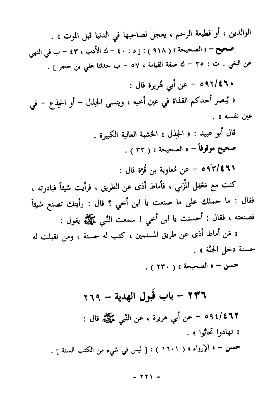462/593 (حسن) عن مُعَاوِيَةُ بْنُ قُرَّةَ قَالَ: كُنْتُ مَعَ مَعْقِلٍ الْمُزَنِيِّ، فَأَمَاطَ أَذًى عن طريق فَرَأَيْتُ شَيْئًا فَبَادَرْتُهُ. فَقَالَ: مَا حَمَلَكَ عَلَى مَا صَنَعْتَ يَا ابْنَ أَخِي؟ قَالَ: رَأَيْتُكَ تَصْنَعُ شيئاً فصنعته. فقال: أَحْسَنْتَ يَا ابْنَ أَخِي! سَمِعْتُ النَّبِيَّ صَلَّى اللهُ عَلَيْهِ وَسَلَّمَ يَقُولُ: "مَنْ أَمَاطَ أَذًى عَنْ طريق مسلمين، كُتِبَ لَهُ حَسَنَةٌ، وَمَنْ تُقُبِّلَتْ لَهُ حَسَنَةٌ، دَخَلَ الْجَنَّةَ".