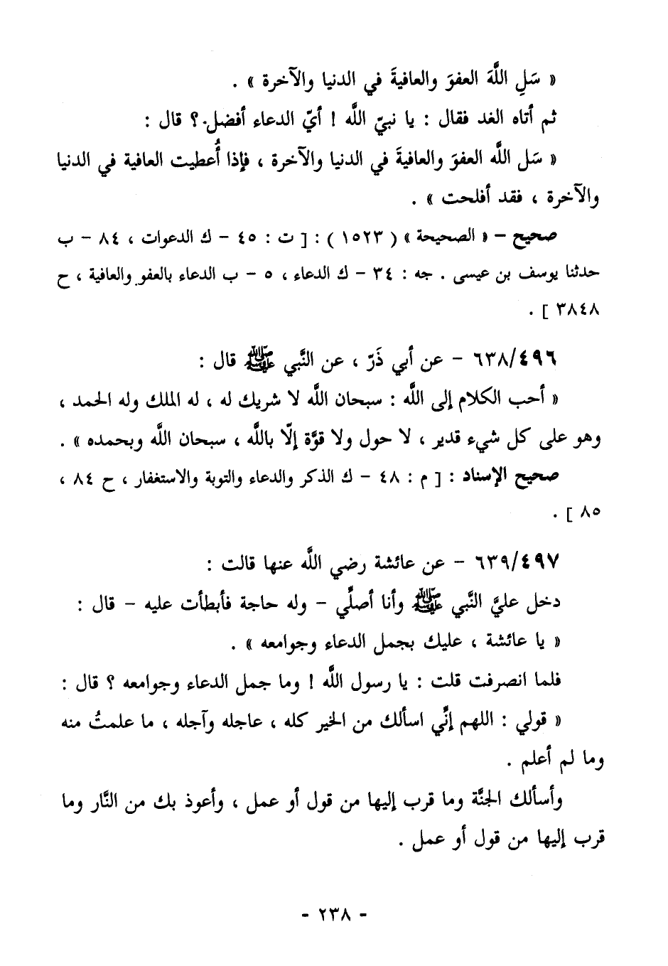 498/639 (صحيح) عَنْ عَائِشَةَ رَضِيَ اللَّهُ عَنْهَا، قَالَتْ: دَخَلَ عَلَيَّ النَّبِيُّ صَلَّى اللهُ عَلَيْهِ وَسَلَّمَ وَأَنَا أُصَلِّي- وَلَهُ حَاجَةٌ، فَأَبْطَأْتُ عَلَيْهِ- قَالَ: " يَا عَائِشَةُ! عَلَيْكِ بجمَل الدُّعَاءِ، وَجَوَامِعِهِ". فَلَمَّا انْصَرَفْتُ، قُلْتُ: يَا رَسُولَ اللَّهِ! وَمَا جُمَلُ الدُّعَاءِ وَجَوَامِعُهُ؟ قَالَ: " قُولِي: اللَّهُمَّ إِنِّي أَسْأَلُكَ مِنَ الْخَيْرِ كُلِّهِ، عَاجِلِهِ وَآجِلِهِ، مَا عَلِمْتُ مِنْهُ وَمَا لَمْ أَعْلَمْ. وَأَعُوذُ بِكَ مِنَ الشَّرِّ كُلِّهِ عَاجِلِهِ وَآجِلِهِ، مَا علمت وَمَا لَمْ أَعْلَمُ. وَأَسْأَلُكَ الْجَنَّةَ وَمَا قَرَّبَ إِلَيْهَا مِنْ قَوْلٍ أَوْ عَمَلٍ، وَأَعُوذُ بِكَ مِنَ النَّارِ وَمَا قَرَّبَ إِلَيْهَا مِنْ قول أو عمل،