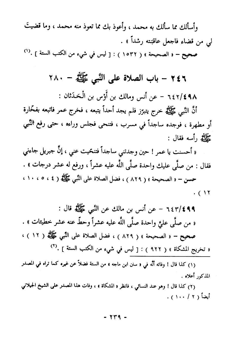 499/642 (حَسَنَ) عن أنس وَمَالِكَ بْنَ أَوْسِ بْنِ الْحَدَثَانِ: أَنَّ النَّبِيَّ صَلَّى اللهُ عَلَيْهِ وَسَلَّمَ خَرَجَ يَتَبَرَّزُ فَلَمْ يَجِدْ أَحَدًا يَتْبَعُهُ، فَخَرَجَ عُمَرُ فَاتَّبَعَهُ بِفَخَّارَةٍ أَوْ مِطْهَرَةٍ، فَوَجَدَهُ سَاجِدًا فِي مِسْرَبٍ، فَتَنَحَّى فَجَلَسَ وَرَاءَهُ، حَتَّى رَفَعَ النَّبِيُّ صَلَّى اللهُ عَلَيْهِ وَسَلَّمَ رَأْسَهُ، فَقَالَ: "أَحْسَنْتَ يَا عُمَرُ حِينَ وَجَدْتَنِي سَاجِدًا فتنحيت عني؛ إن جبريل جائني فَقَالَ: مَنْ صَلَّى عَلَيْكَ وَاحِدَةً صَلَّى اللَّهُ عَلَيْهِ عَشْرًا، وَرَفَعَ له عشر درجات".