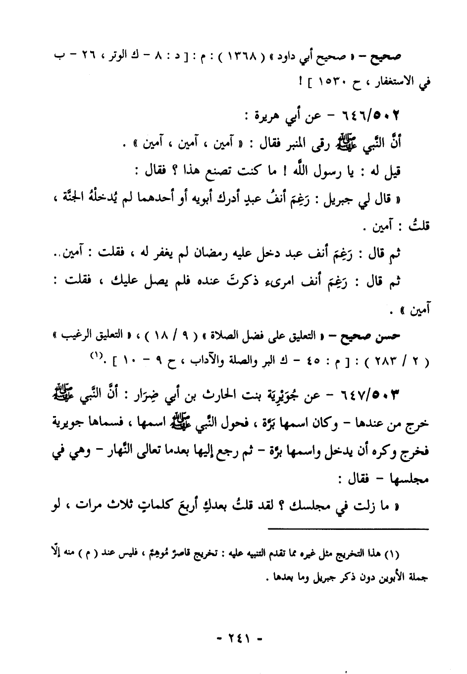 503/646 (حسن صحيح) عَنْ أَبِي هُرَيْرَةَ: أَنَّ النَّبِيَّ صَلَّى اللهُ عَلَيْهِ وَسَلَّمَ رَقَى الْمِنْبَرَ فَقَالَ: "آمِينَ، آمِينَ، آمِينَ" قِيلَ لَهُ: يَا رَسُولَ اللَّهِ! مَا كُنْتَ تَصْنَعُ هَذَا؟ فَقَالَ: " قَالَ لِي جِبْرِيلُ: رَغِمَ أَنْفُ عَبْدٍ أَدْرَكَ أَبَوَيْهِ أَوْ أَحَدَهُمَا لَمْ يُدْخِلْهُ الْجَنَّةَ. قُلْتُ: آمِينَ. ثُمَّ قَالَ: رَغِمَ أَنْفُ عَبْدٍ دَخَلَ عَلَيْهِ رَمَضَانُ لَمْ يُغْفَرْ لَهُ. فَقُلْتُ: آمِينَ. ثُمَّ قَالَ: رَغِمَ أَنْفُ امْرِئٍ ذُكرتَ عِنْدَهُ فَلَمْ يُصَلِّ عَلَيْكَ، فَقُلْتُ: آمِينَ ".