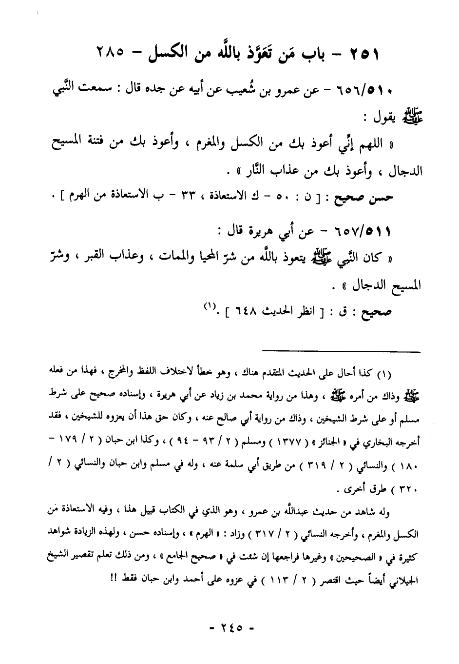 511/656 (حسن صحيح) عَنْ عَمْرِو بْنِ شُعَيْبٍ، عَنْ أَبِيهِ، عَنْ جَدِّهِ قَالَ: سَمِعْتُ النَّبِيَّ صَلَّى اللهُ عَلَيْهِ وَسَلَّمَ يَقُولُ: " اللَّهُمَّ إِنِّي أَعُوذُ بِكَ مِنَ الْكَسَلِ وَالْمَغْرَمِ، وَأَعُوذُ بِكَ من فتنة المسيح الدجال،