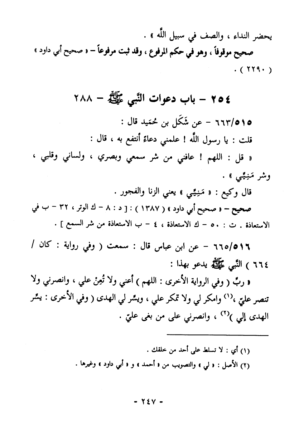 517/665 (صحيح) عَنِ ابْنِ عَبَّاسٍ قَالَ: سَمِعْتُ [وفي رواية: كَانَ/664] النَّبِيُّ صَلَّى اللهُ عَلَيْهِ وسلم يدعو بهذا: " رب [وفي الرواية الأخرى: اللَّهُمَّ [أَعِنِّي وَلَا تُعِنْ عَلَيَّ، وَانْصُرْنِي وَلَا تَنْصُرْ عَلَيَّ (¬1) وَامْكُرْ لِي وَلَا تَمْكُرْ عَلَيَّ، وَيَسِّرْ لي الهدى] وفي الأخرى: يسر الهدى إلي (¬2) ] ، وَانْصُرْنِي عَلَى مَنْ بَغَى عَلَيَّ.