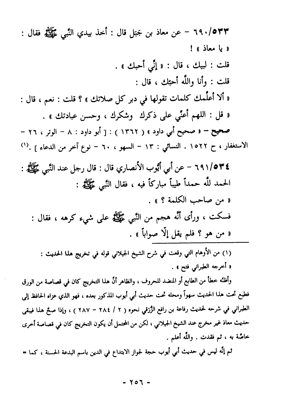 534/690 (صحيح) عَنْ مُعَاذِ بْنِ جَبَلٍ قَالَ: أَخَذَ بِيَدِي النَّبِيُّ صَلَّى اللهُ عَلَيْهِ وَسَلَّمَ فَقَالَ: "يَا مُعَاذُ"! قُلْتُ: لَبَّيْكَ. قَالَ: "إِنِّي أُحِبُّكَ". قُلْتُ: وَأَنَا وَاللَّهِ أُحِبُّكَ. قَالَ: "أَلَا أُعَلِّمُكَ كَلِمَاتٍ تَقُولُهَا فِي دُبُرِ كُلِّ صَلَاتِكَ"؟ قُلْتُ: نَعَمْ. قَالَ: "قُلِ: اللَّهُمَّ أَعِنِّي عَلَى ذكرك وشكرك، وحسن عبادتك".
