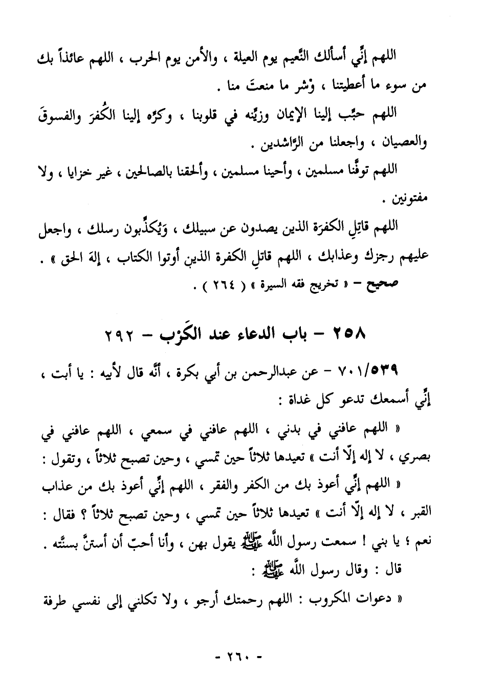 542/701 (حسن) عَنْ عَبْدِ الرَّحْمَنِ بْنِ أَبِي بَكْرَةَ، أَنَّهُ قَالَ لِأَبِيهِ: يَا أبت عَنْ عَبْدِ الرَّحْمَنِ بْنِ أَبِي بَكْرَةَ، أَنَّهُ قَالَ لِأَبِيهِ: يَا أَبَتِ! إِنِّي أَسْمَعُكَ تَدْعُو كُلَّ غَدَاةٍ: "اللَّهُمَّ عَافِنِي فِي بَدَنِي، اللَّهُمَّ عَافِنِي فِي سَمْعِي، اللَّهُمَّ عَافِنِي فِي بَصَرِي، لَا إِلَهَ إِلَّا أَنْتَ"، تُعِيدُهَا ثَلَاثًا حِينَ تُمْسِي، وَحِينَ تُصْبِحُ ثَلَاثًا، وَتَقُولُ: "اللَّهُمَّ إِنِّي أَعُوذُ بِكَ مِنْ الْكُفْرِ وَالْفَقْرِ، اللَّهُمَّ إِنِّي أَعُوذُ بِكَ مِنْ عَذَابِ الْقَبْرِ، لَا إِلَهَ إِلَّا أَنْتَ". تُعِيدُهَا ثَلَاثًا حِينَ تُمْسِي، وَحِينَ تُصْبِحُ ثَلَاثًا؟ فَقَالَ: نَعَمْ؛ يَا بُنَيَّ! سَمِعْتُ رَسُولَ اللَّهِ صَلَّى اللهُ عَلَيْهِ وَسَلَّمَ يَقُولُ بِهِنَّ. وَأَنَا أُحِبُّ أن أستن بسنته. قَالَ: وَقَالَ رَسُولُ اللَّهِ صَلَّى اللهُ عَلَيْهِ وَسَلَّمَ: " دَعَوَاتُ الْمَكْرُوبِ: اللَّهُمَّ رَحْمَتَكَ أَرْجُو، وَلَا تَكِلْنِي إلى نفسي طرفة
