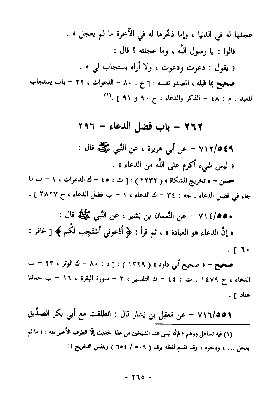 553/714 (صحيح) عَنِ النُّعْمَانِ بْنِ بَشِيرٍ، عَنِ النَّبِيَّ صَلَّى اللهُ عَلَيْهِ وَسَلَّمَ قَالَ: " إِنَّ الدُّعَاءَ هُوَ الْعِبَادَةُ" ثُمَّ قَرَأَ: {ادْعُونِي أَسْتَجِبْ لَكُمْ} [غافر: 60] .