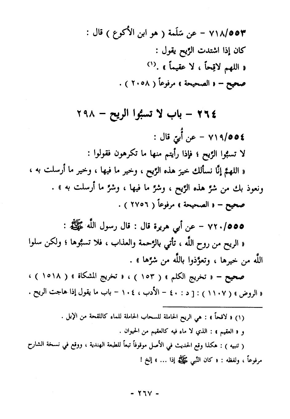 557/719 (صحيح) عَنْ أَبِي قَالَ: لَا تَسُبُّوا الرِّيحَ؛ فَإِذَا رَأَيْتُمْ مِنْهَا مَا تَكْرَهُونَ، فَقُولُوا: "اللَّهُمَّ إِنَّا نَسْأَلُكَ خَيْرَ هَذِهِ الرِّيحِ، وَخَيْرَ مَا فِيهَا وَخَيْرَ مَا أُرسلت بِهِ، وَنَعُوذُ بِكَ مِنْ شَرِّ هَذِهِ الرِّيحِ، وَشَرِّ مَا فِيهَا، وَشَرِّ ما أرسلت به ".