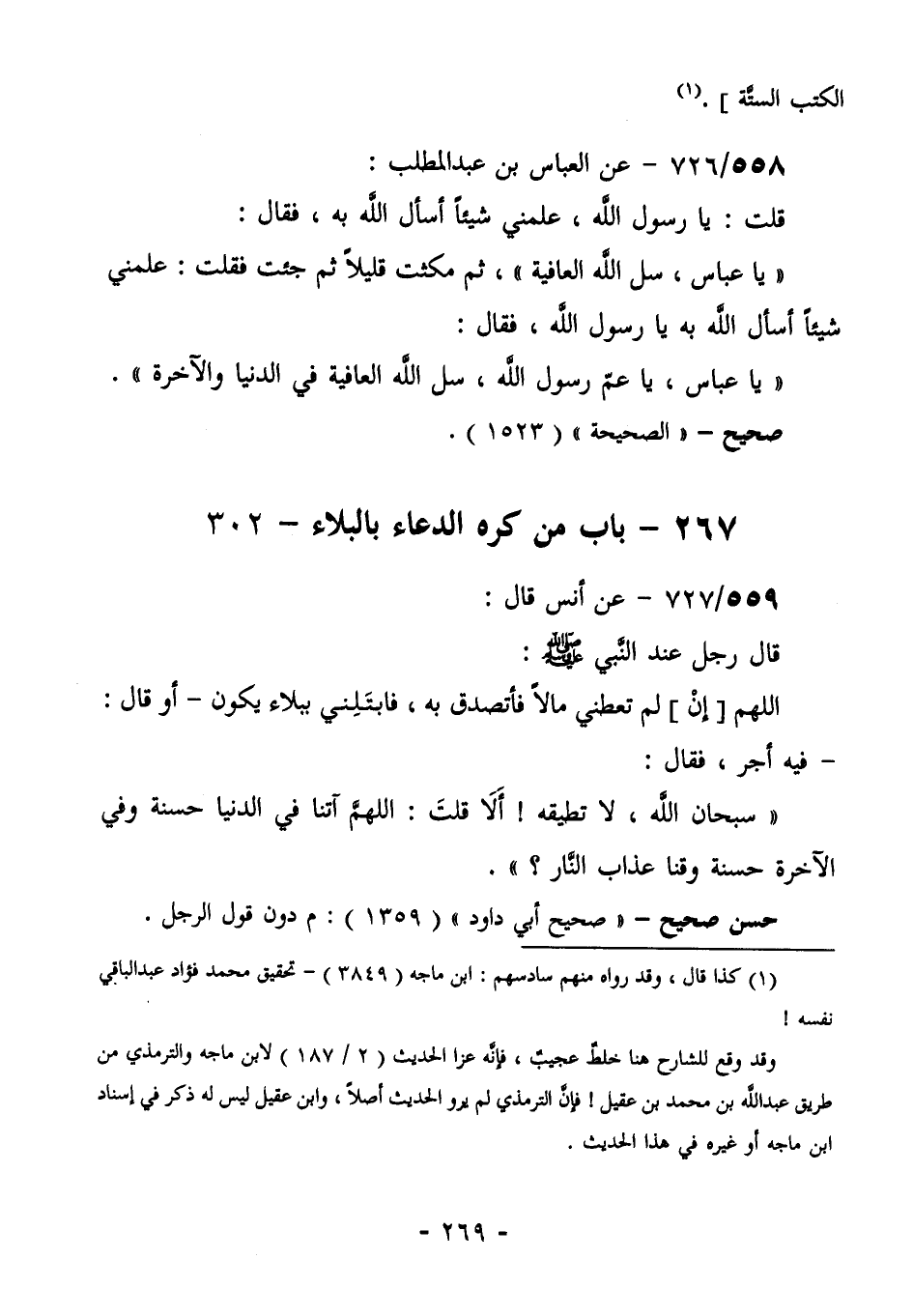562/726 (صحيح) عَنِ الْعَبَّاسِ بْنِ عَبْدِ الْمُطَّلِبِ، قُلْتُ: يَا رَسُولَ اللَّهِ! عَلِّمْنِي شَيْئًا أَسْأَلُ اللَّهَ بِهِ. فَقَالَ: "يَا عَبَّاسُ! سَلِ اللَّهَ الْعَافِيَةَ"، ثم مكث ثَلَاثًا، ثُمَّ جِئْتُ فَقُلْتُ: عَلِّمْنِي شَيْئًا أَسْأَلُ اللَّهَ بِهِ يَا رَسُولَ اللَّهِ!. فَقَالَ: " يَا عَبَّاسُ! يَا عَمَّ رَسُولِ اللَّهِ! سَلِ اللَّهَ الْعَافِيَةَ فِي الدُّنْيَا وَالْآخِرَةِ".