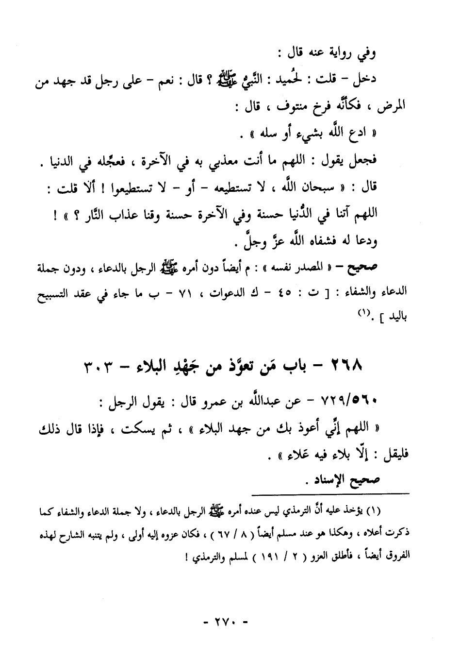 564/729 (صحيح الإسناد) عَنْ عَبْدِ اللَّهِ بْنِ عَمْرٍو قَالَ: يَقُولُ الرَّجُلُ: "اللَّهُمَّ إِنِّي أَعُوذُ بِكَ مِنْ جَهْدِ الْبَلَاءِ" ثُمَّ يَسْكُتُ، فَإِذَا قَالَ ذَلِكَ فَلْيَقُلْ: "إِلَّا بَلَاءً فِيهِ عَلَاءٌ".
