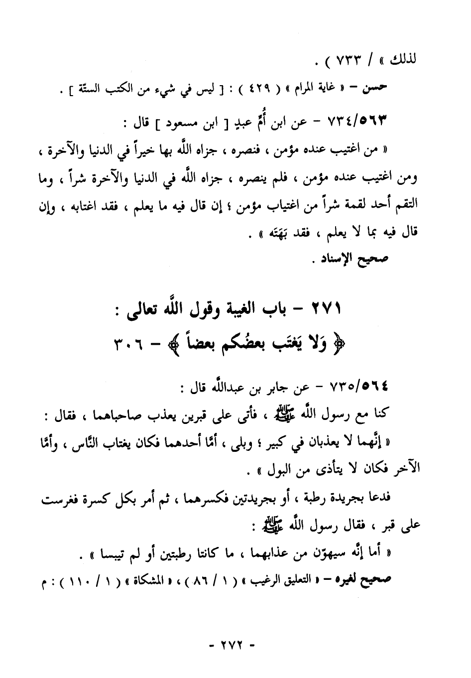 568/735 (صحيح لغيره) عَنْ جَابِرِ بْنِ عَبْدِ اللَّهِ قَالَ: كُنَّا مَعَ رَسُولِ اللَّهِ صَلَّى اللهُ عَلَيْهِ وَسَلَّمَ، فَأَتَى عَلَى قَبْرَيْنِ يُعَذَّبُ صَاحِبَاهُمَا، فَقَالَ: "إِنَّهُمَا لَا يُعَذَّبَانِ فِي كَبِيرٍ؛ وَبَلَى، أَمَّا أَحَدُهُمَا: فَكَانَ يَغْتَابُ النَّاسَ، وَأَمَّا الْآخَرُ: فَكَانَ لَا يَتَأَذَّى مِنَ الْبَوْلِ". فَدَعَا بِجَرِيدَةٍ رَطْبَةٍ، أَوْ بِجَرِيدَتَيْنِ، فَكَسَرَهُمَا، ثُمَّ أَمَرَ بِكُلِّ كِسْرَةٍ فَغُرِسَتْ عَلَى قَبْرٍ، فَقَالَ رَسُولُ اللَّهِ صَلَّى اللهُ عَلَيْهِ وَسَلَّمَ: " أَمَا إِنَّهُ سَيُهَوَّنُ مِنْ عَذَابِهِمَا، مَا كَانَتَا رطبتين، أو: لم تيبسا".