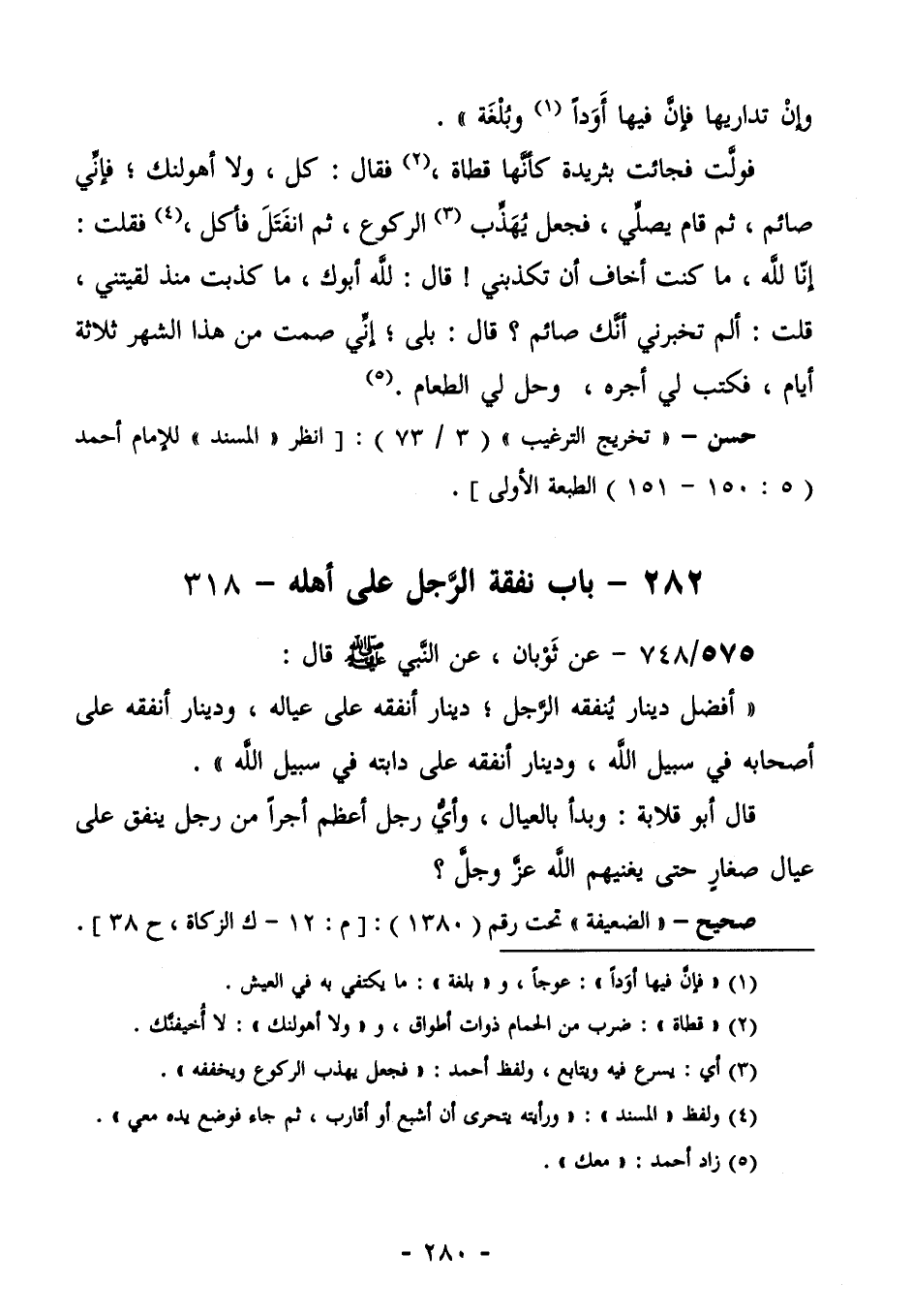 579/748- (صحيح) عَنْ ثَوْبَانَ، عَنِ النَّبِيِّ صَلَّى اللهُ عَلَيْهِ وَسَلَّمَ قَالَ: " إِنَّ مِنْ أَفْضَلِ دِينَارٍ أَنْفَقَهُ الرَّجُلُ عَلَى عِيَالِهِ، وَدِينَارٌ أَنْفَقَهُ عَلَى أَصْحَابِهِ فِي سَبِيلِ اللَّهِ، وَدِينَارٌ أَنْفَقَهُ عَلَى دَابَّتِهِ فِي سَبِيلِ اللَّهِ ". قَالَ أَبُو قِلَابَةَ: وَبَدَأَ بِالْعِيَالِ، وَأَيُّ رَجُلٍ أَعْظَمُ أَجْرًا مِنْ رَجُلٍ يُنْفِقُ عَلَى عِيَالٍ صغارٍ حَتَّى يُغْنِيَهُمُ اللَّهُ عَزَّ وجل؟