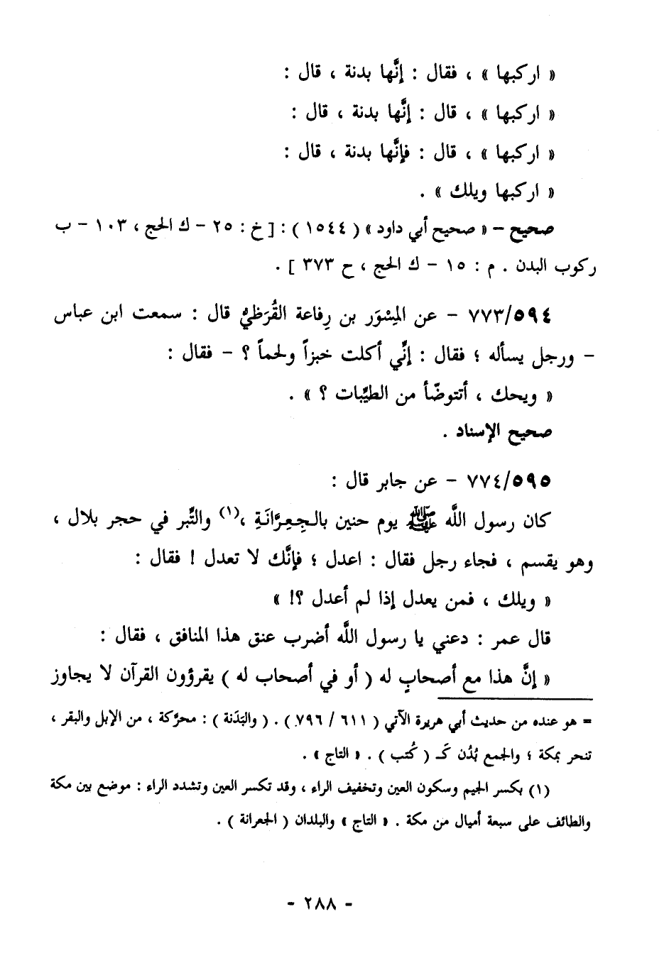 599/774- (صحيح) عَنْ جَابِرٍ قَالَ: كَانَ رَسُولُ اللَّهِ صَلَّى اللهُ عَلَيْهِ وَسَلَّمَ يَوْمَ حُنَيْنٍ بِالْجِعْرَانَةِ (¬1) ، وَالتِّبْرُ فِي حِجْرِ بِلَالٍ، وَهُوَ يَقْسِمُ، فَجَاءَهُ رَجُلٌ فَقَالَ: اعْدِلْ؛ فَإِنَّكَ لَا تَعْدِلُ! فَقَالَ: "وَيْلَكَ، فَمَنْ يَعْدِلُ إلا لَمْ أَعْدِلُ؟! ". قَالَ عُمَرُ: دَعْنِي يَا رَسُولَ اللَّهِ أَضْرِبُ عُنُقَ هَذَا الْمُنَافِقِ. فَقَالَ: "إِنَّ هَذَا مع أصحاب له- أوفي أَصْحَابٍ لَهُ- يَقْرَؤُونَ الْقُرْآنَ، لَا يُجاوز