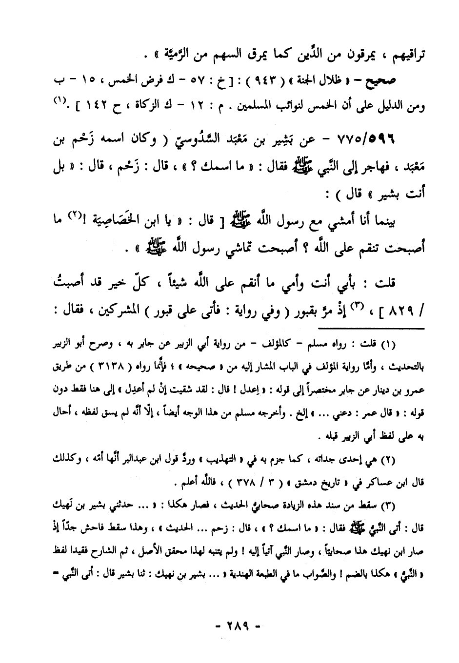 600/775- (صحيح) عن بشير [بن معبد السدوسي]- وَكَانَ اسْمُهُ: زَحْمَ بْنَ مَعْبَدٍ، فَهَاجَرَ إِلَى النَّبِيِّ صَلَّى اللهُ عَلَيْهِ وَسَلَّمَ فَقَالَ: "مَا اسْمُكَ؟ "، قَالَ: زَحْمٌ. قَالَ: "بَلْ أَنْتَ بشير". قال: بينما أَمْشِي مَعَ رَسُولِ اللَّهِ صَلَّى اللهُ عَلَيْهِ وَسَلَّمَ [قَالَ: "يَا ابْنَ الْخَصَاصِيَةِ! (¬1) مَا أَصْبَحْتَ تَنْقِمُ عَلَى اللَّهِ؟ أَصْبَحْتَ تُمَاشِي رَسُولَ اللَّهِ صَلَّى اللهُ عَلَيْهِ وَسَلَّمَ". قلت: بأبي أنت وَأُمِّي مَا أَنْقِمُ عَلَى اللَّهِ شَيْئًا، كُلَّ خَيْرٍ قَدْ أَصَبْتُ/829] (¬2) ، إذ مر بقبور [وفي رواية: فَأَتَى عَلَى قُبُورِ] الْمُشْرِكِينَ. فَقَالَ: