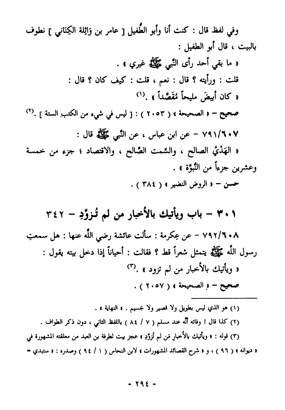 612/792- (صحيح) عن عكرمة: سَأَلْتُ عَائِشَةَ رَضِيَ اللَّهُ عَنْهَا: هَلْ سَمِعْتِ رَسُولَ اللَّهِ صَلَّى اللهُ عَلَيْهِ وَسَلَّمَ يَتَمَثَّلُ شِعْرًا قَطُّ؟ فَقَالَتْ: أَحْيَانًا إِذَا دَخَلَ بَيْتَهُ يَقُولُ: "وَيَأْتِيكَ بِالْأَخْبَارِ مَنْ لم تزود" (¬2) .