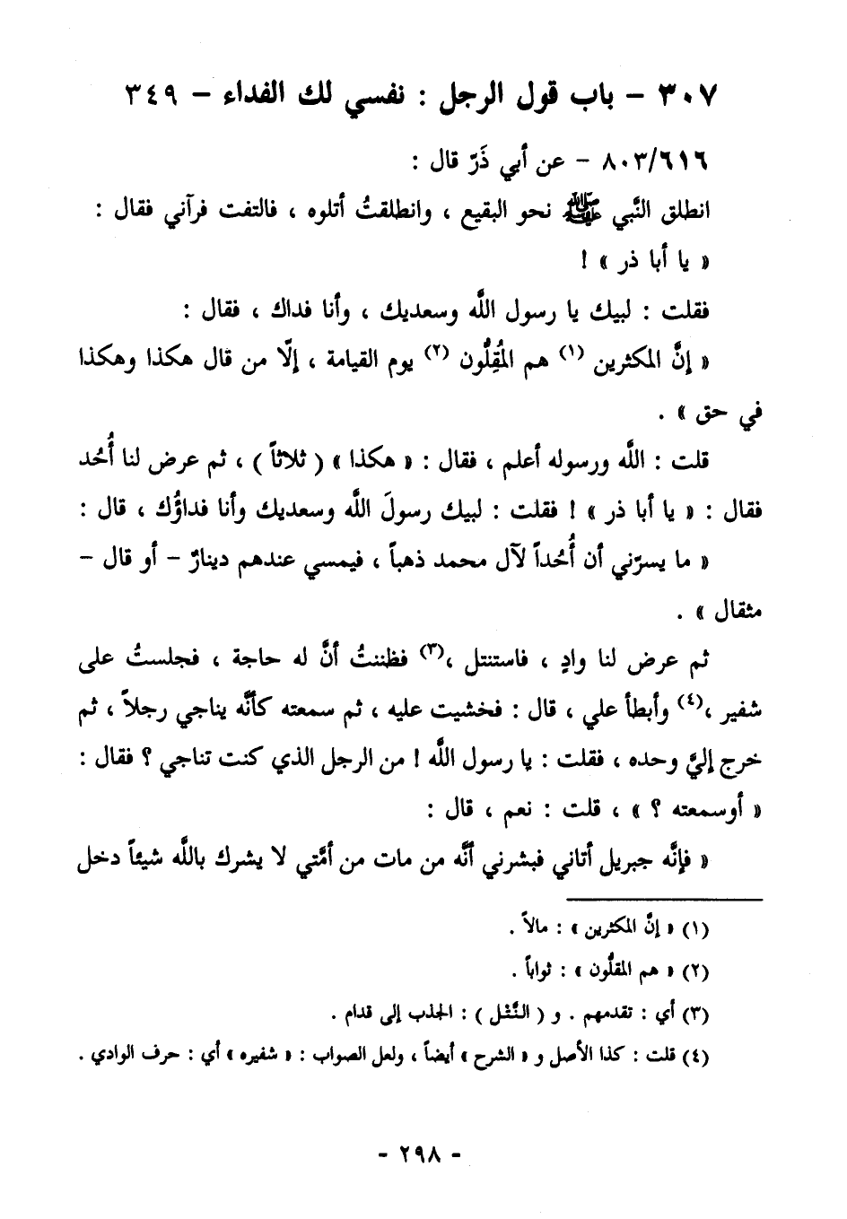 620/803- (صحيح) عَنْ أَبِي ذَرٍّ [قَالَ] : فَانْطَلَقَ النَّبِيَّ صَلَّى اللهُ عَلَيْهِ وَسَلَّمَ نَحْوَ الْبَقِيعِ، وَانْطَلَقْتُ أَتْلُوهُ، فَالْتَفَتَ فَرَآنِي. فَقَالَ: "يَا أَبَا ذَرٍّ! ". فَقُلْتُ: لَبَّيْكَ يَا رَسُولَ اللَّهِ وَسَعْدَيْكَ، وَأَنَا فِدَاؤُكَ، فَقَالَ: "إِنَّ الْمُكْثِرِينَ (¬1) هُمُ الْمُقِلُّونَ (¬2) يَوْمَ الْقِيَامَةِ، إِلَّا مَنْ قَالَ هَكَذَا وَهَكَذَا فِي حَقٍّ ". قُلْتُ: اللَّهُ وَرَسُولُهُ أعلم. فقال: "هكذا " (ثلاثاً) ، ثم عَرَضَ لَنَا أُحُد فَقَالَ: " يَا أَبَا ذَرٍّ! " فَقُلْتُ: لَبَّيْكَ يَا رَسُولَ اللَّهِ وَسَعْدَيْكَ، وَأَنَا فِدَاؤُكَ، قَالَ: "مَا يَسُرُّنِي أَنَّ أُحُداً لِآلِ مُحَمَّدٍ ذَهَبًا، فَيُمْسِي عِنْدَهُمْ دينار- أوقال- مِثْقَالٌ". ثُمَّ عُرضَ لَنَا وَادٍ، فَاسْتَنْتَلَ (¬3) فَظَنَنْتُ أَنَّ لَهُ حَاجَةً، فَجَلَسْتُ عَلَى شفيرٍ (¬4) ، وَأَبْطَأَ عَلَيَّ، قَالَ: فَخَشِيتُ عَلَيْهِ، ثُمَّ سَمِعْتُهُ كَأَنَّهُ يُنَاجِي رَجُلًا، ثُمَّ خَرَجَ إِلَيَّ وَحْدَهُ. فَقُلْتُ: يَا رَسُولَ اللَّهِ! مَنِ الرَّجُلُ الَّذِي كُنْتَ تُنَاجِي؟ فَقَالَ: "أَوَ سَمِعْتَهُ؟ " قُلْتُ: نَعَمْ. قَالَ: "فَإِنَّهُ جِبْرِيلُ أَتَانِي، فَبَشَّرَنِي أَنَّهُ مَنْ مَاتَ مِنْ أُمَّتِي لَا يُشْرِكُ بِاللَّهِ شَيْئًا دخل