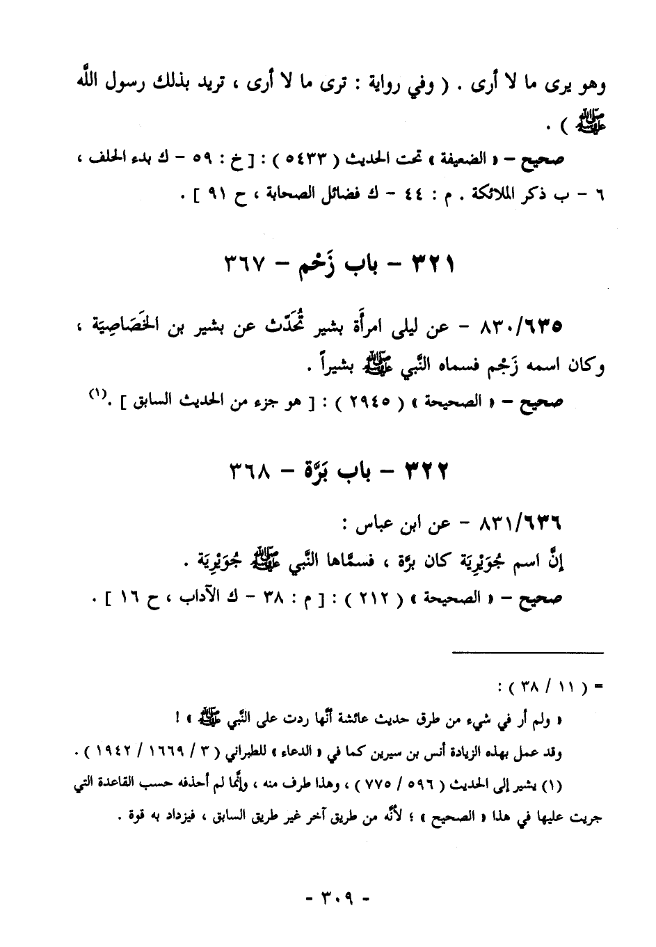 639/830- (صحيح) عن لَيْلَى؛ امْرَأَةَ بَشِيرٍ تُحَدِّثُ، عَنْ بشير بن الخصاصية. وكان اسمه: زحم. فَسَمَّاهُ النَّبِيُّ صَلَّى اللهُ عَلَيْهِ وسلم: بشيراً.