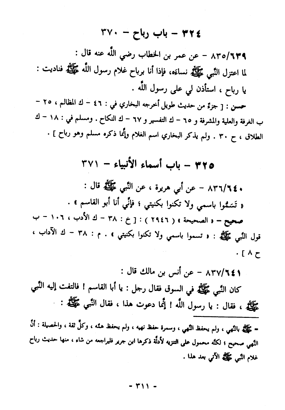 645/837 (صحيح) عَنْ أَنَسِ بْنِ مَالِكٍ قَالَ: كَانَ النَّبِيُّ صَلَّى اللهُ عَلَيْهِ وَسَلَّمَ فِي السُّوقِ، فَقَالَ رَجُلٌ: يَا أَبَا الْقَاسِمِ! فَالْتَفَتَ إِلَيْهِ النَّبِيَّ صَلَّى اللهُ عَلَيْهِ وَسَلَّمَ. فَقَالَ: يَا رَسُولَ اللَّهِ! إِنَّمَا دَعَوْتُ هَذَا. فَقَالَ النَّبِيُّ صَلَّى الله عليه وسلم:
