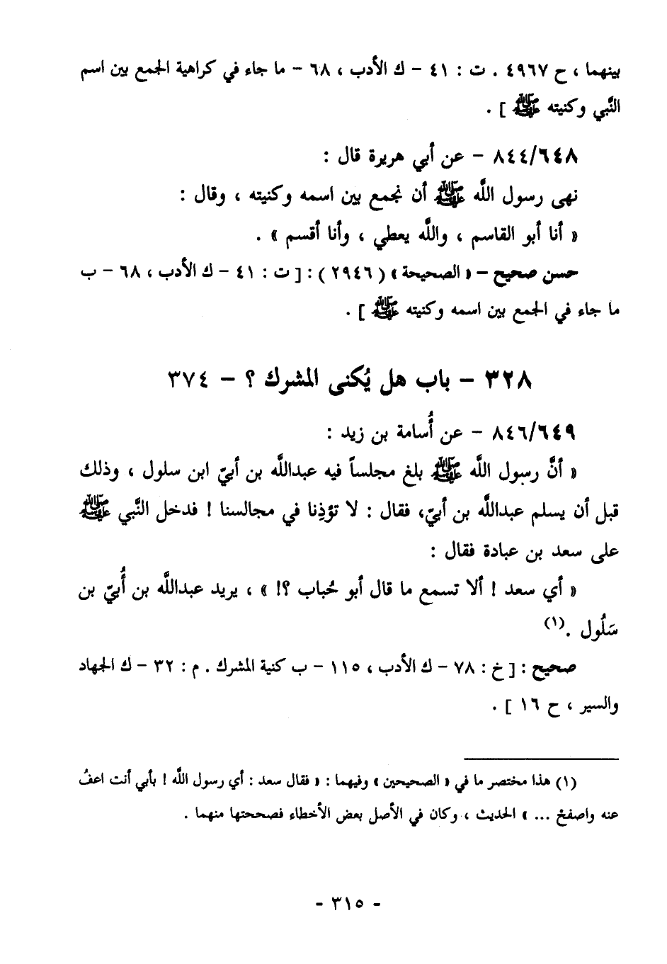 652/844 (حسن صحيح) عَنْ أَبِي هُرَيْرَةَ، قَالَ: نَهَى رَسُولَ اللَّهِ صَلَّى اللهُ عَلَيْهِ وَسَلَّمَ أَنْ نَجْمَعَ بَيْنَ اسْمِهِ وَكُنْيَتِهِ، وَقَالَ: "أَنَا أَبُو الْقَاسِمِ، والله يعطي، وأنا أقسم".