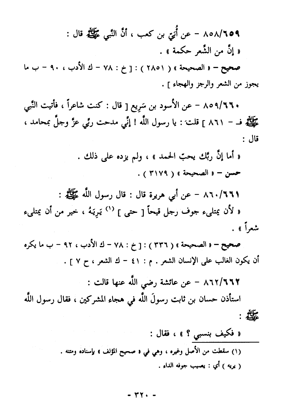 663/858 (صحيح) عن أبي بن كعب؛ أَنَّ رَسُولَ اللَّهِ صَلَّى اللهُ عَلَيْهِ وَسَلَّمَ قَالَ: "إِنَّ مِنْ الشعر حكمة".