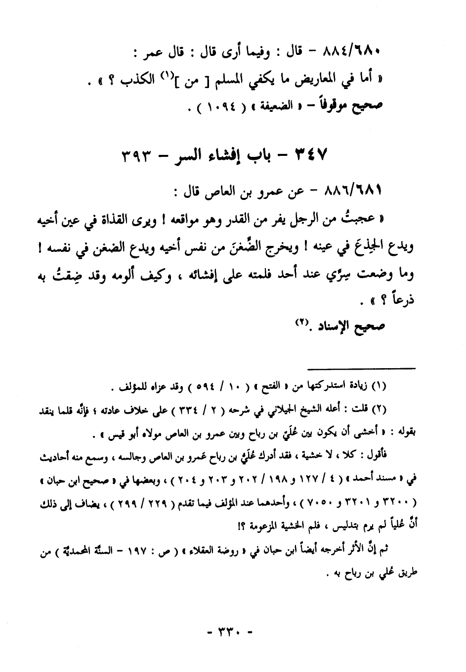 685/886- (صحيح الإسناد) عَنْ عَمْرِو بْنِ الْعَاصِ قَالَ: " عَجِبْتُ مِنَ الرَّجُلِ يَفِرُّ مِنَ الْقَدَرِ، وَهُوَ مُوَاقِعُهُ! وَيَرَى الْقَذَاةَ فِي عَيْنِ أَخِيهِ، وَيَدَعُ الْجِذْعَ فِي عَيْنِهِ! وَيُخْرِجُ الضَّغْنَ مِنْ نَفْسِ أَخِيهِ، وَيَدَعُ الضَّغْنَ فِي نَفْسِهِ! وَمَا وَضَعْتُ سِرِّي عِنْدَ أحد فلمتُه على إفشاءه، وَكَيْفَ أَلُومُهُ وَقَدْ ضِقْتُ بِهِ ذراعاً؟ ".