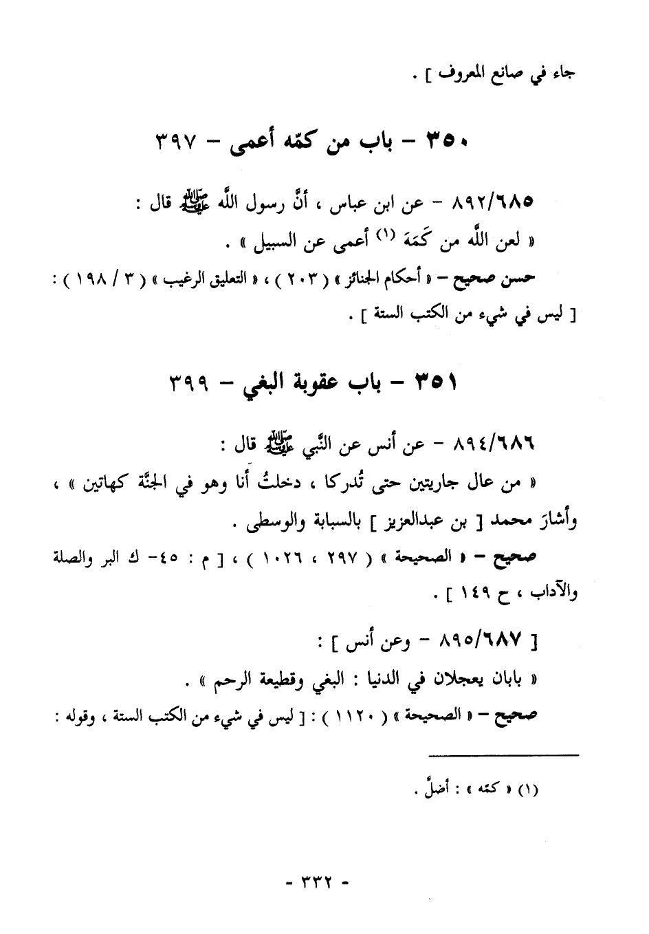 689/892- عَنِ ابْنِ عَبَّاسٍ؛ أَنَّ رَسُولَ اللَّهِ صَلَّى اللهُ عَلَيْهِ وَسَلَّمَ قَالَ: " لَعَنَ اللَّهُ مَنْ كَمَّهَ (¬1) أعمى عن السبيل".